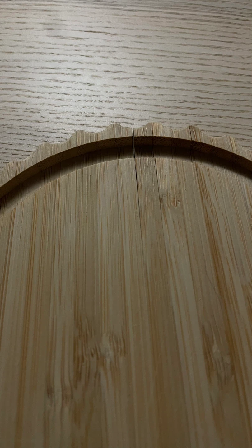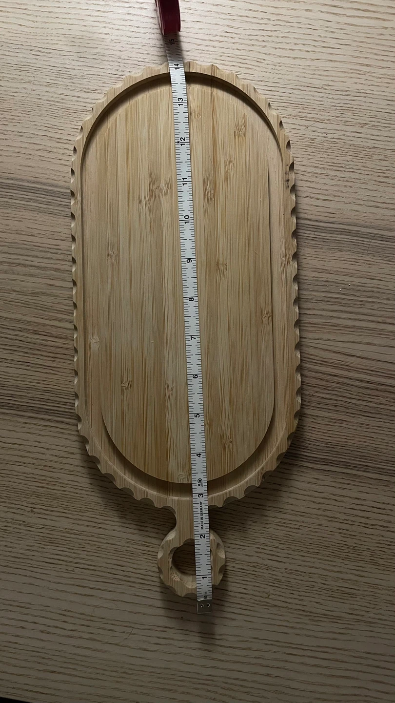 Bamboo serving platter with handle. Measures approximately 13 inches long and 7.5 inches wide. Decorative carved edges. Has some signs of use.