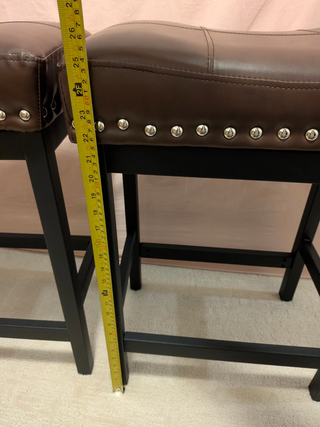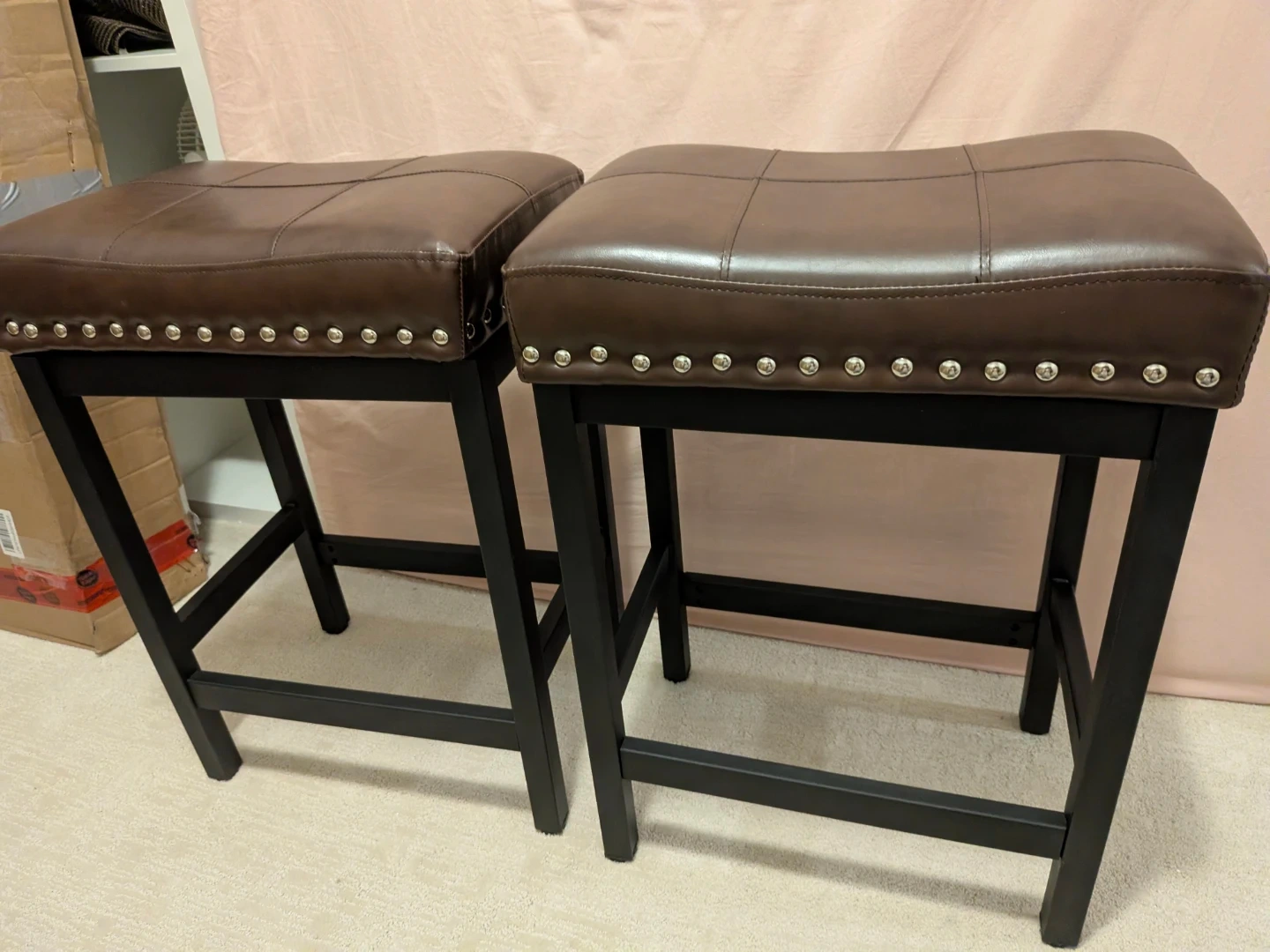 Selling a set of two brown faux leather bar stools. They're in great shape and would look lovely in any kitchen or bar area.