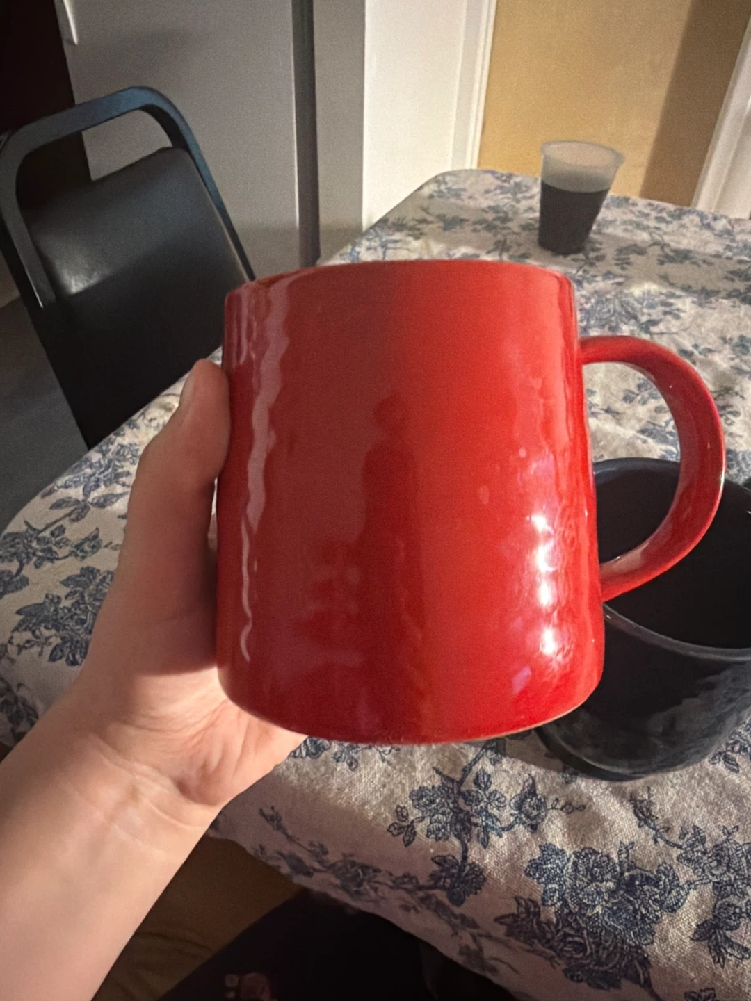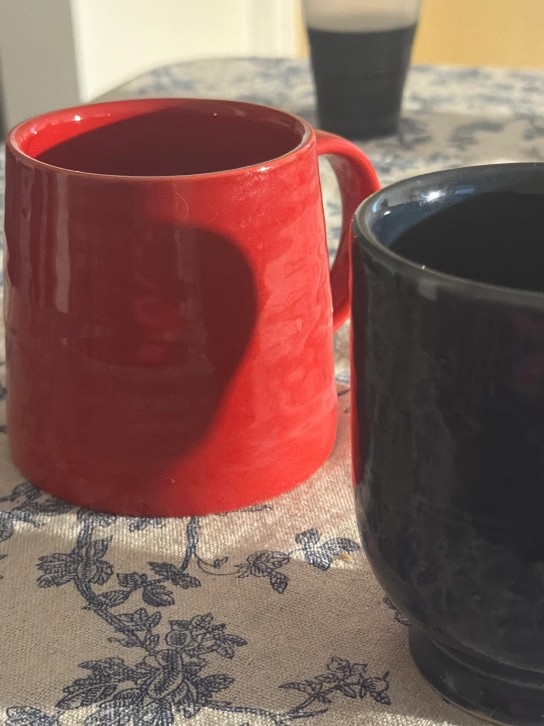 Two ceramic mugs, one red and one dark blue. Sturdy construction and comfortable handles. Perfect for your morning coffee or tea!