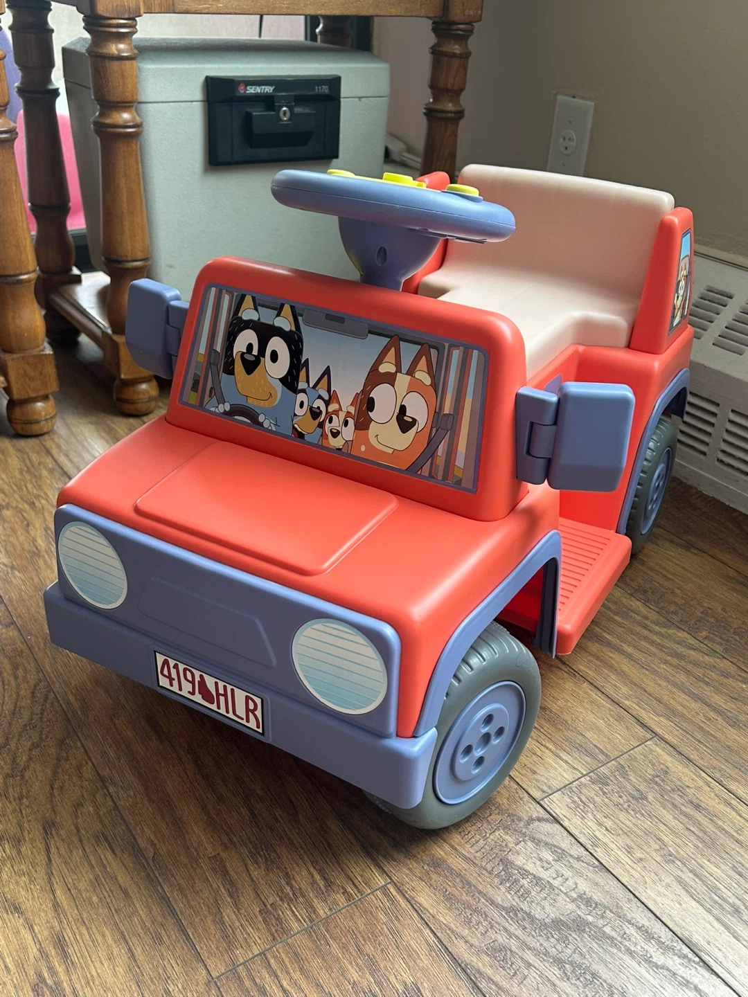 BRAND NEW! Only a few weeks old! This Bluey ride-on car features a colorful steering wheel and character decals. It's perfect for little ones who love imaginative play. The ride-on is made of durable plastic and includes a cup holder.
