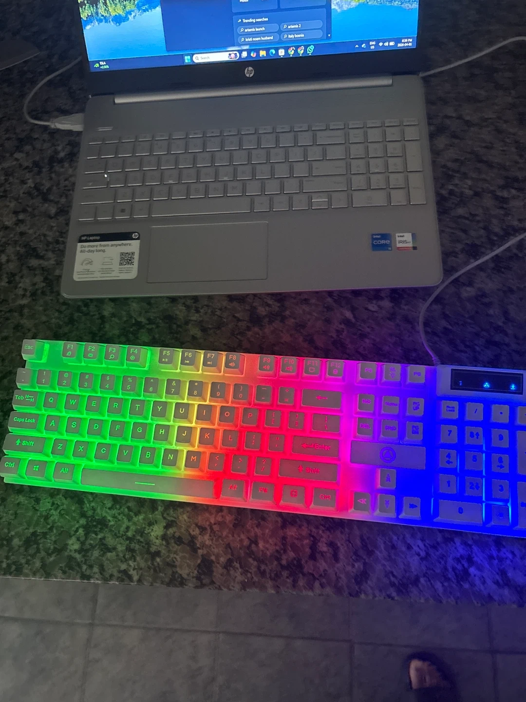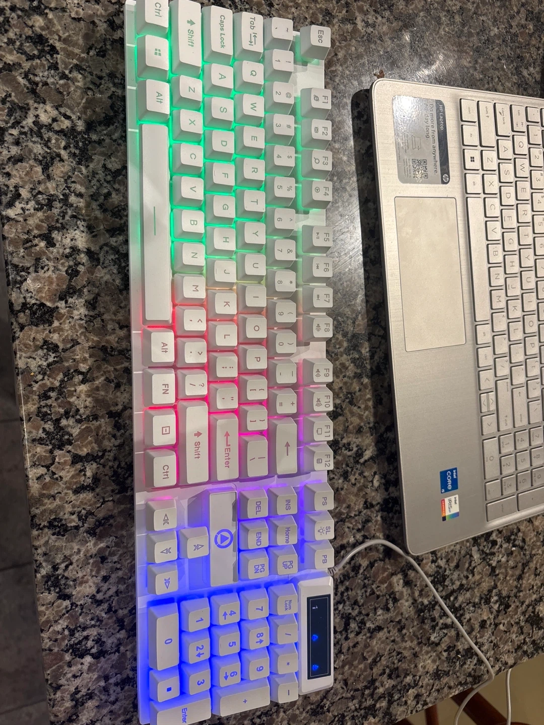 This is a full-size wired mechanical keyboard with customizable RGB backlighting. It features a white chassis and is compatible with Windows and Mac. It's great for typing or gaming!
