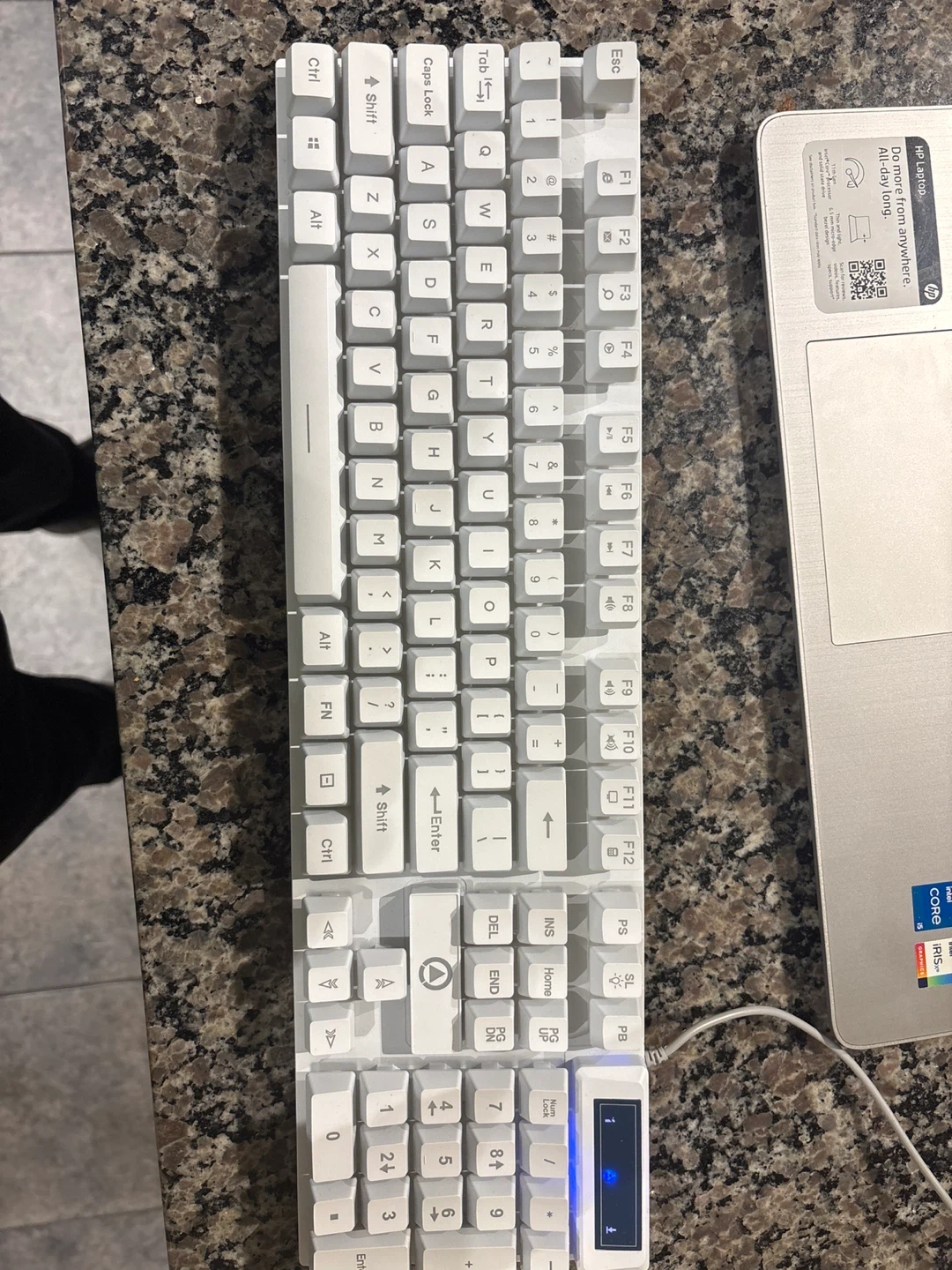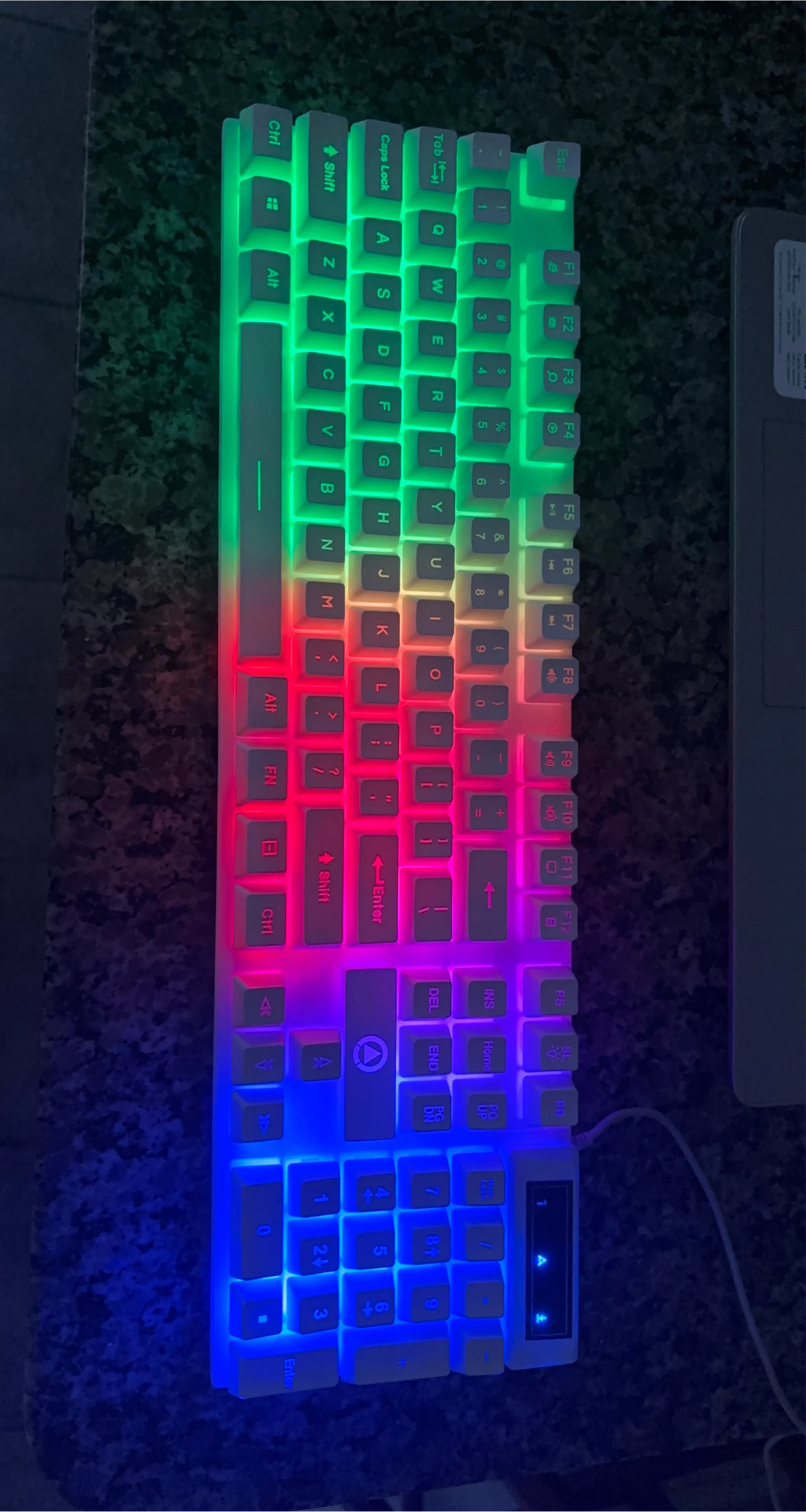 This is a full-size wired mechanical keyboard with customizable RGB backlighting. It features a white chassis and is compatible with Windows and Mac. It's great for typing or gaming!