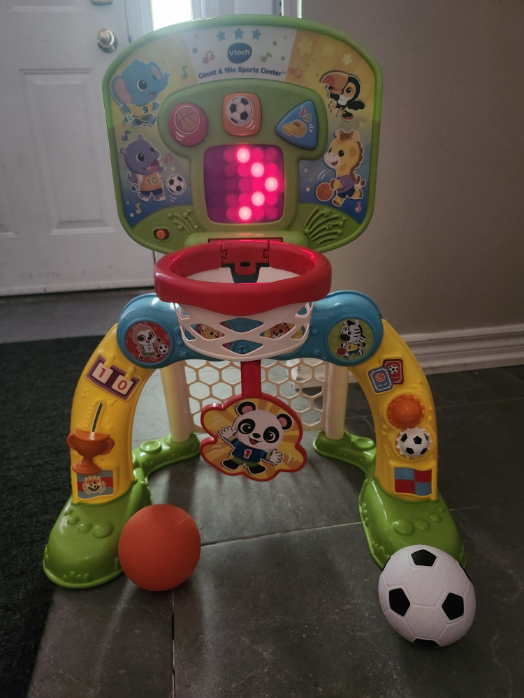 Selling a VTech Count & Win Sports Center! This interactive toy is great for toddlers. It helps them learn numbers and sports skills. Comes with a basketball and a soccer ball for hours of fun!