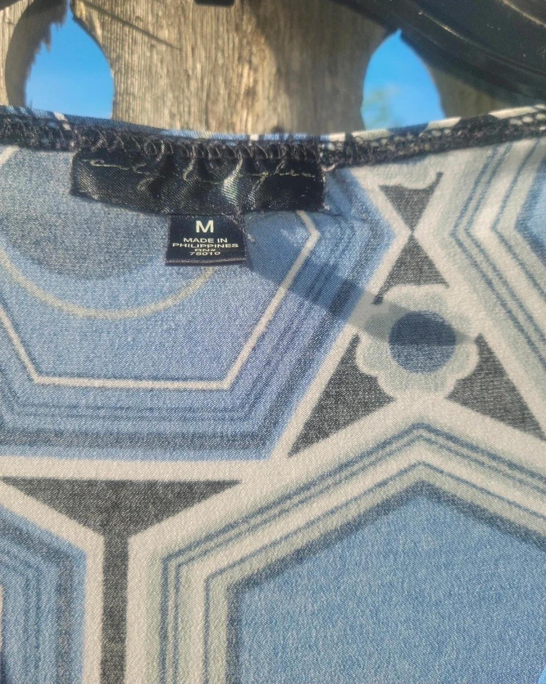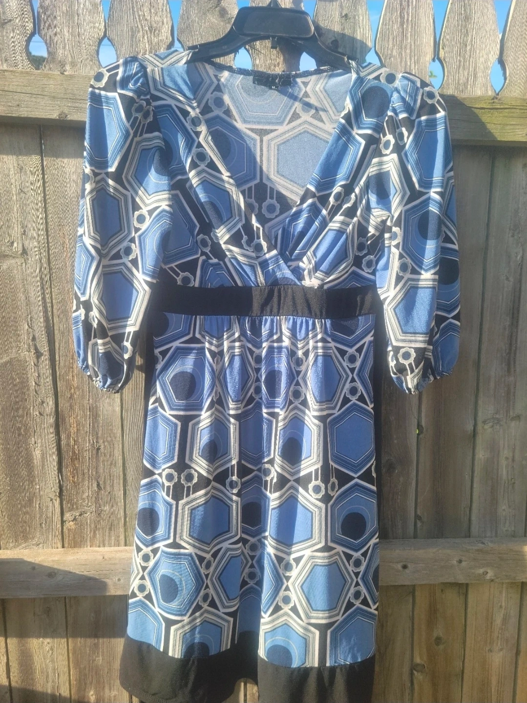 This is a women's blue geometric print wrap dress. It features a V-neckline, 3/4 sleeves, and a tie waist. Made in the Philippines.