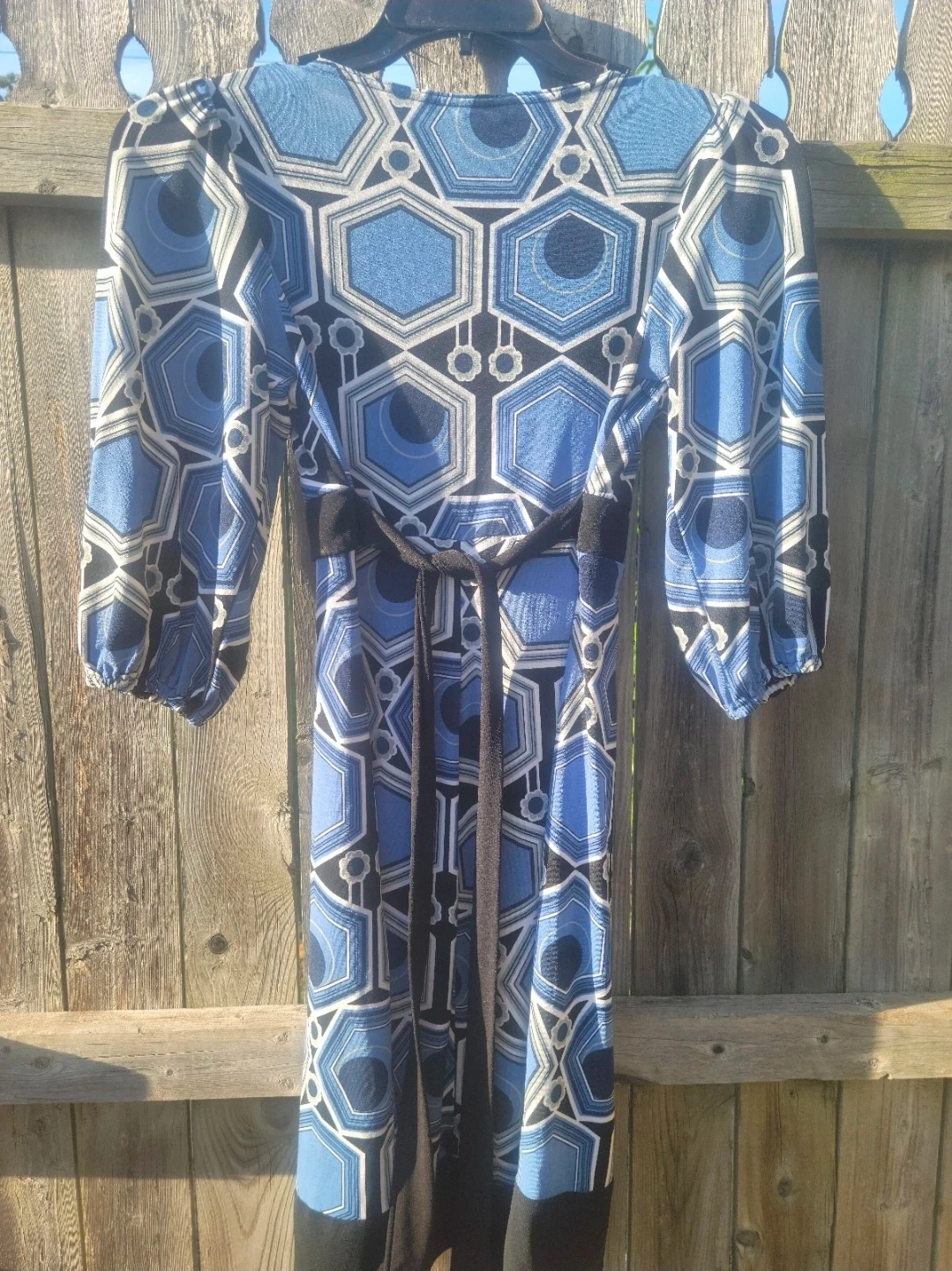 This is a women's blue geometric print wrap dress. It features a V-neckline, 3/4 sleeves, and a tie waist. Made in the Philippines.