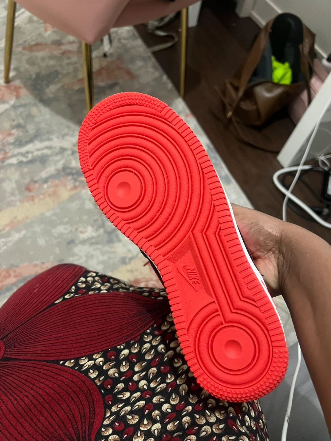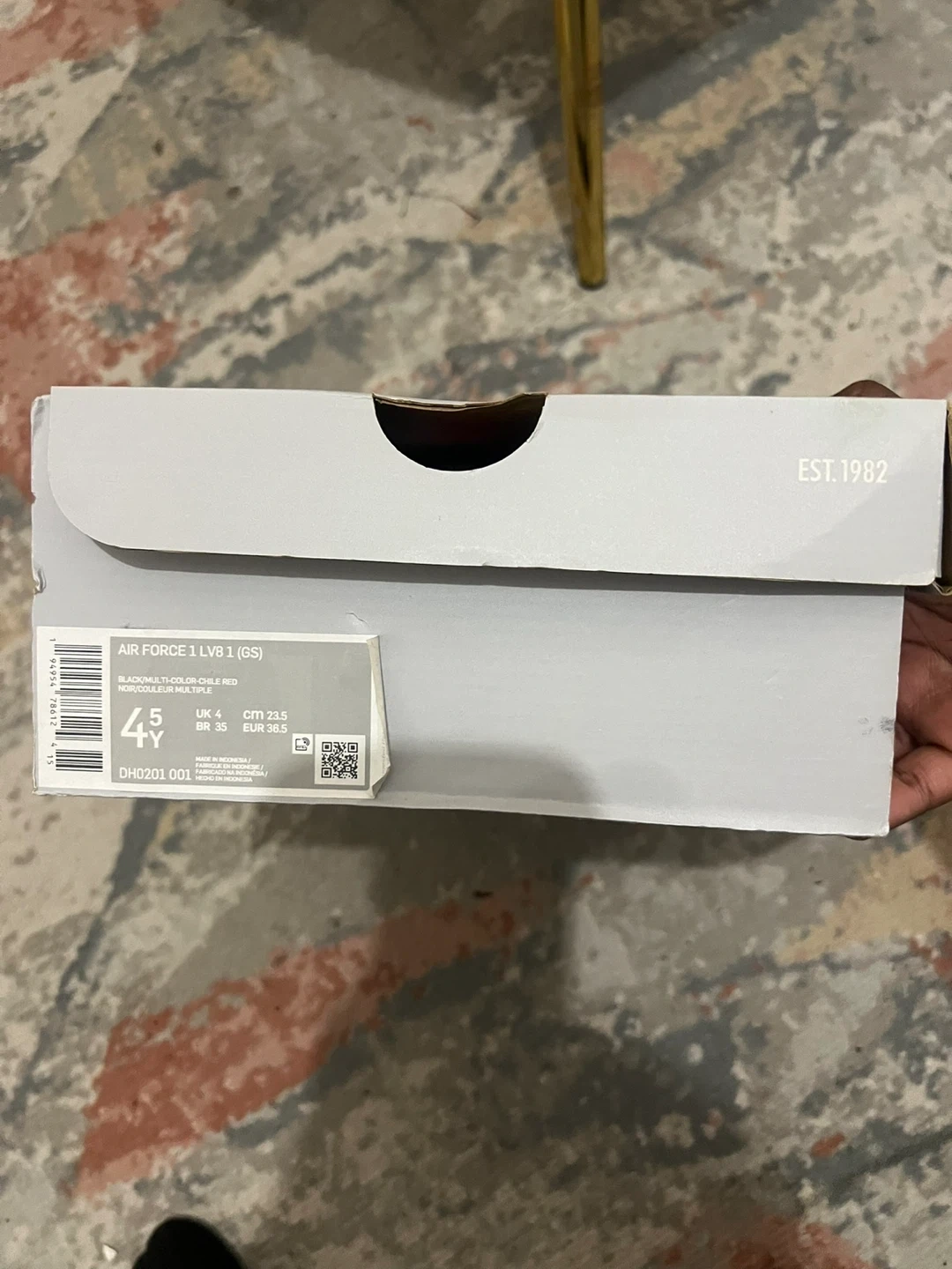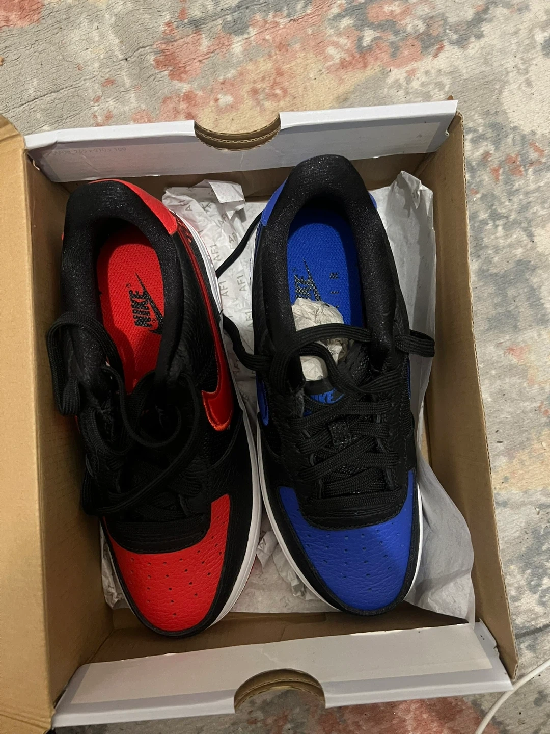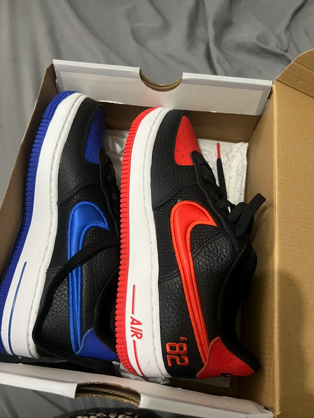 Selling a pair of Brand new Nike Air Force 1 '82 sneakers. One shoe is black with red accents, and the other is black with blue accents. They come with the original box!