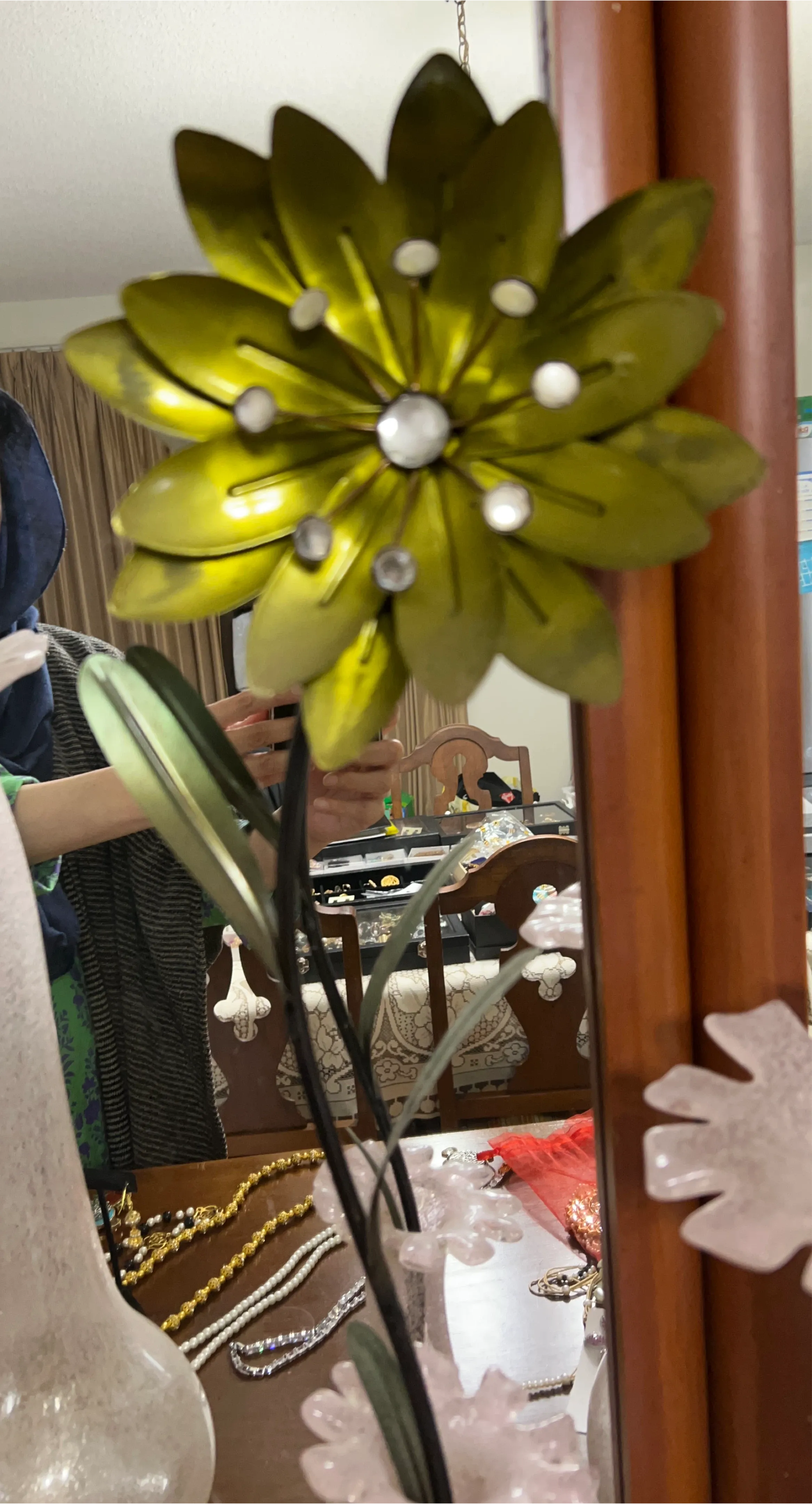 Green metal flower with faux gems