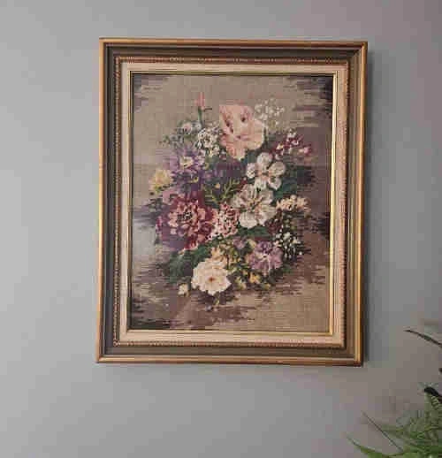 Add a touch of vintage charm to your home with this beautifully hand crafted, needlepoint artwork featuring a colourful floral design. It's professionally framed in a solid wood, ornate gold-tone frame (22 1/2 x 18 1/2 inches). The tapestry is made in England