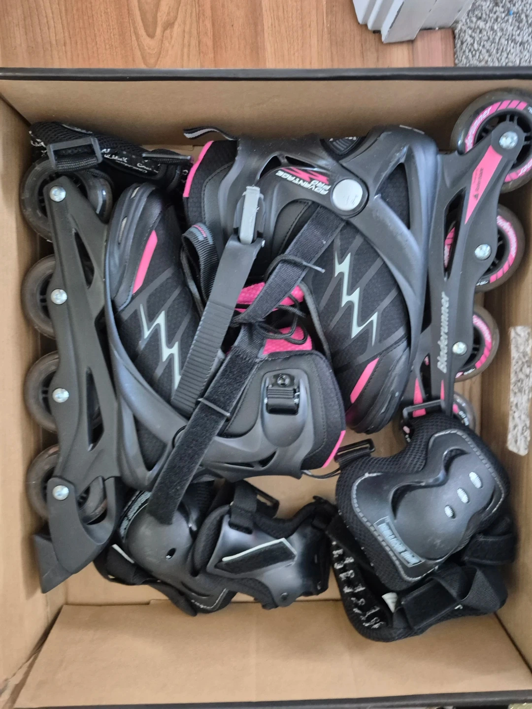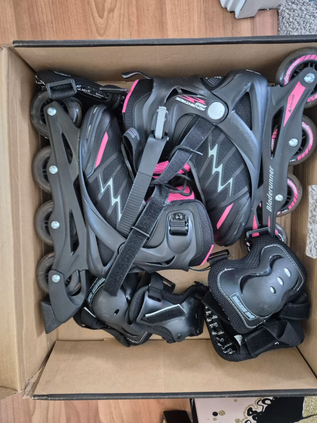 This set includes a pair of black and pink BladeRunner inline skates along with protective gear for wrists, elbows, and knees. They are designed for an adjustable fit. Great for learning to skate!
