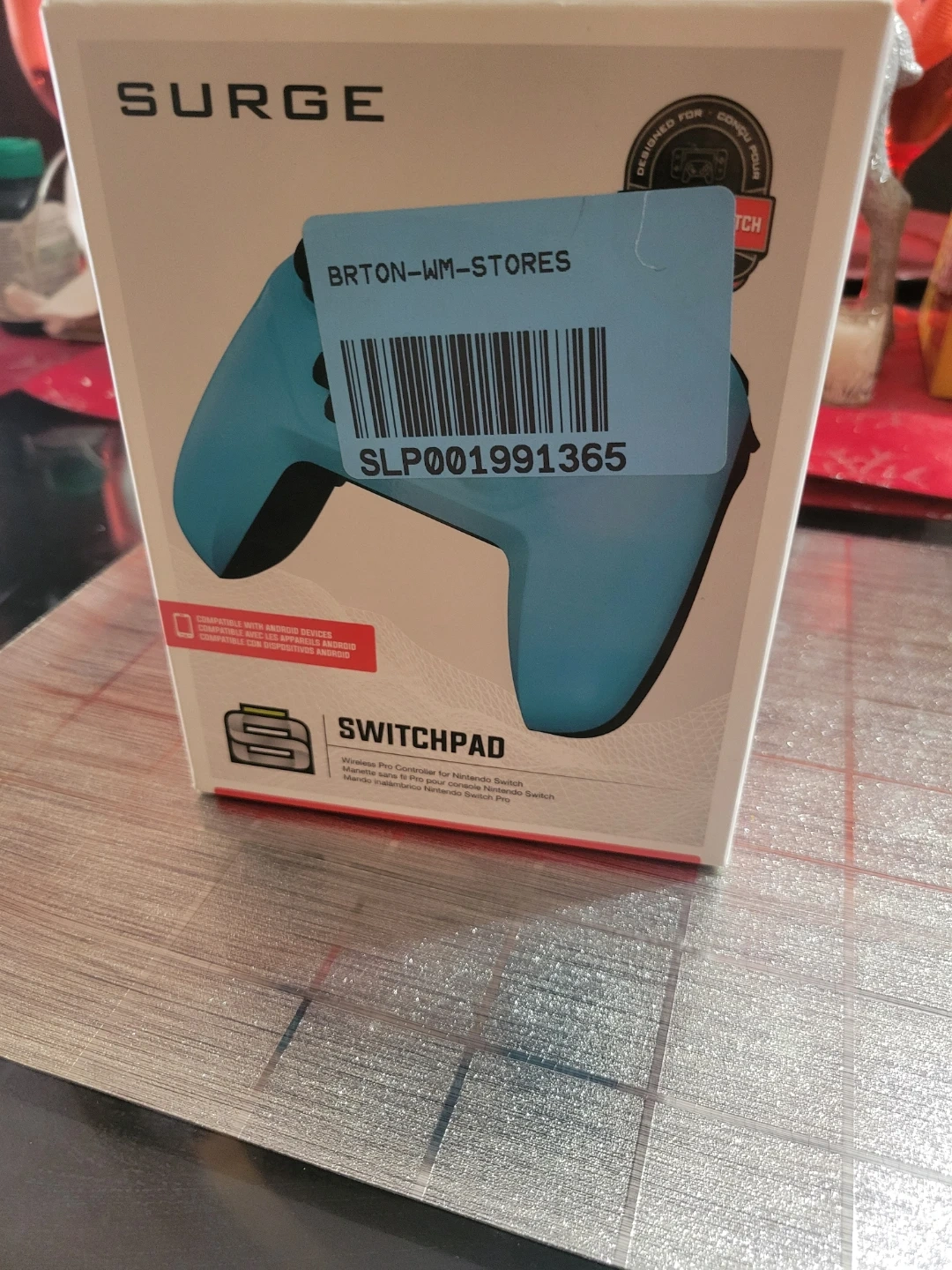 This is a Surge SwitchPad Wireless Pro Controller designed for Nintendo Switch. It's blue and compatible with Android devices. It features a rechargeable battery and 4 macro buttons.