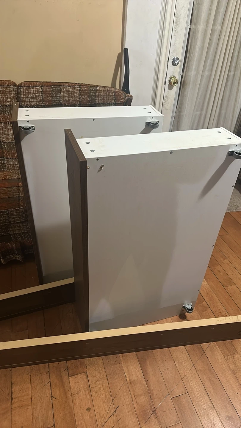 Selling a couple of cabinet units, featuring a clean white finish with brown accents. They have a sturdy build and are equipped with wheels for easy moving. Perfect for adding some extra storage!