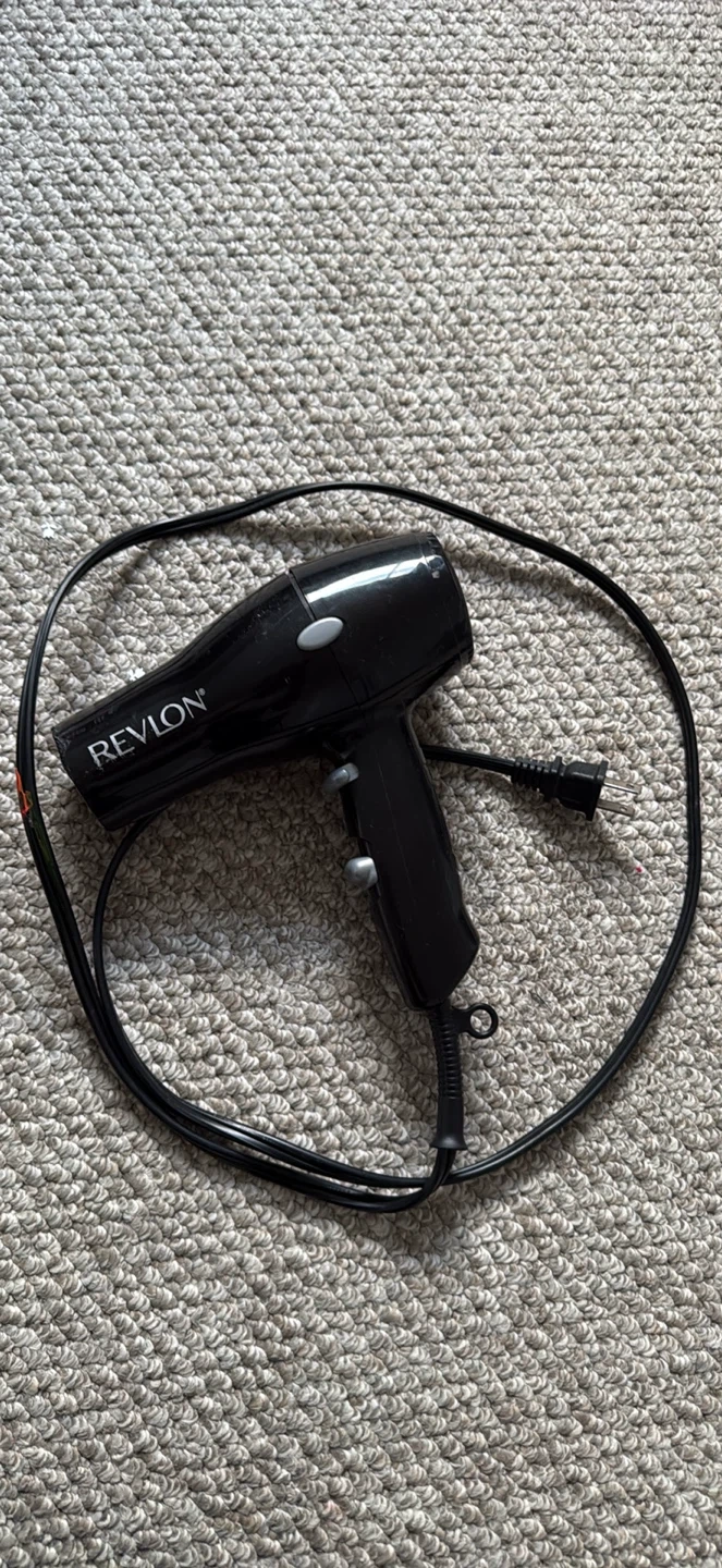 This is a black Revlon travel hair dryer. It's lightweight and easy to pack for trips. A handy device for quick touch-ups on the go!