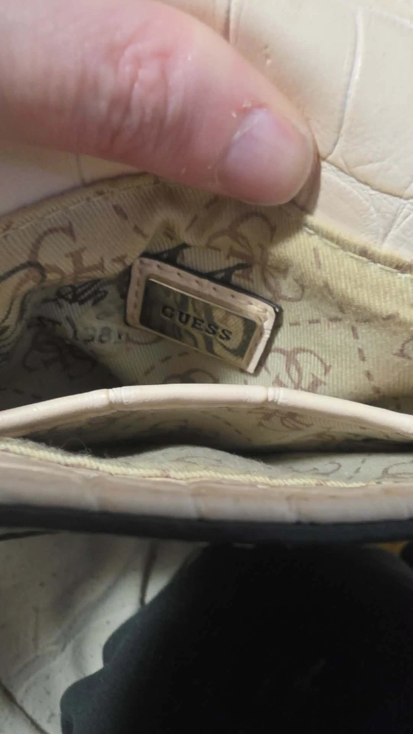 This is a pink Guess 1981 crossbody bag with a crocodile embossed pattern. It features a silver chain strap and a classic flap closure. This stylish accessory adds a touch of sophistication to any outfit.