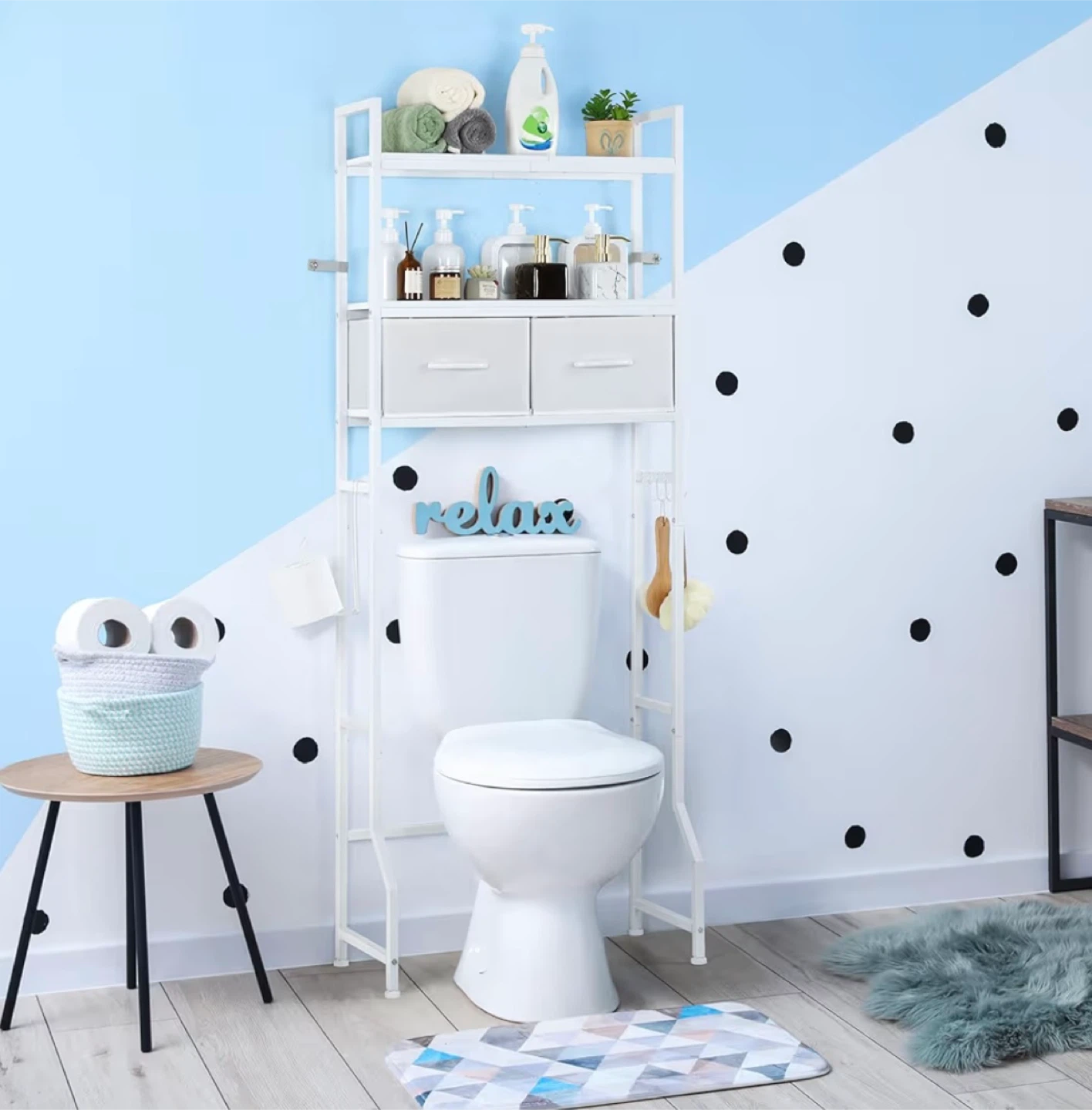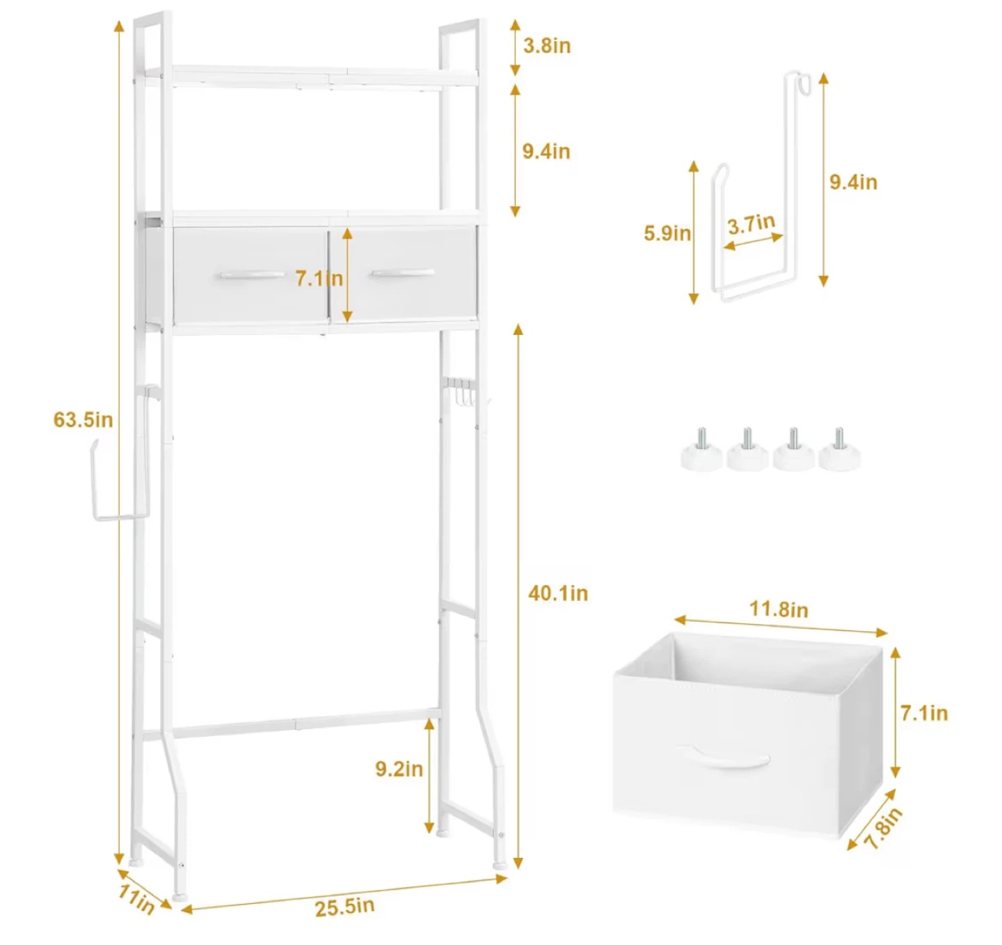 S This bathroom storage shelf unit is white metal with two fabric drawers. It includes a toilet paper holder and 4 hooks for hanging items. Dimensions are 25.5in wide, 11in deep, and 63.5in high.