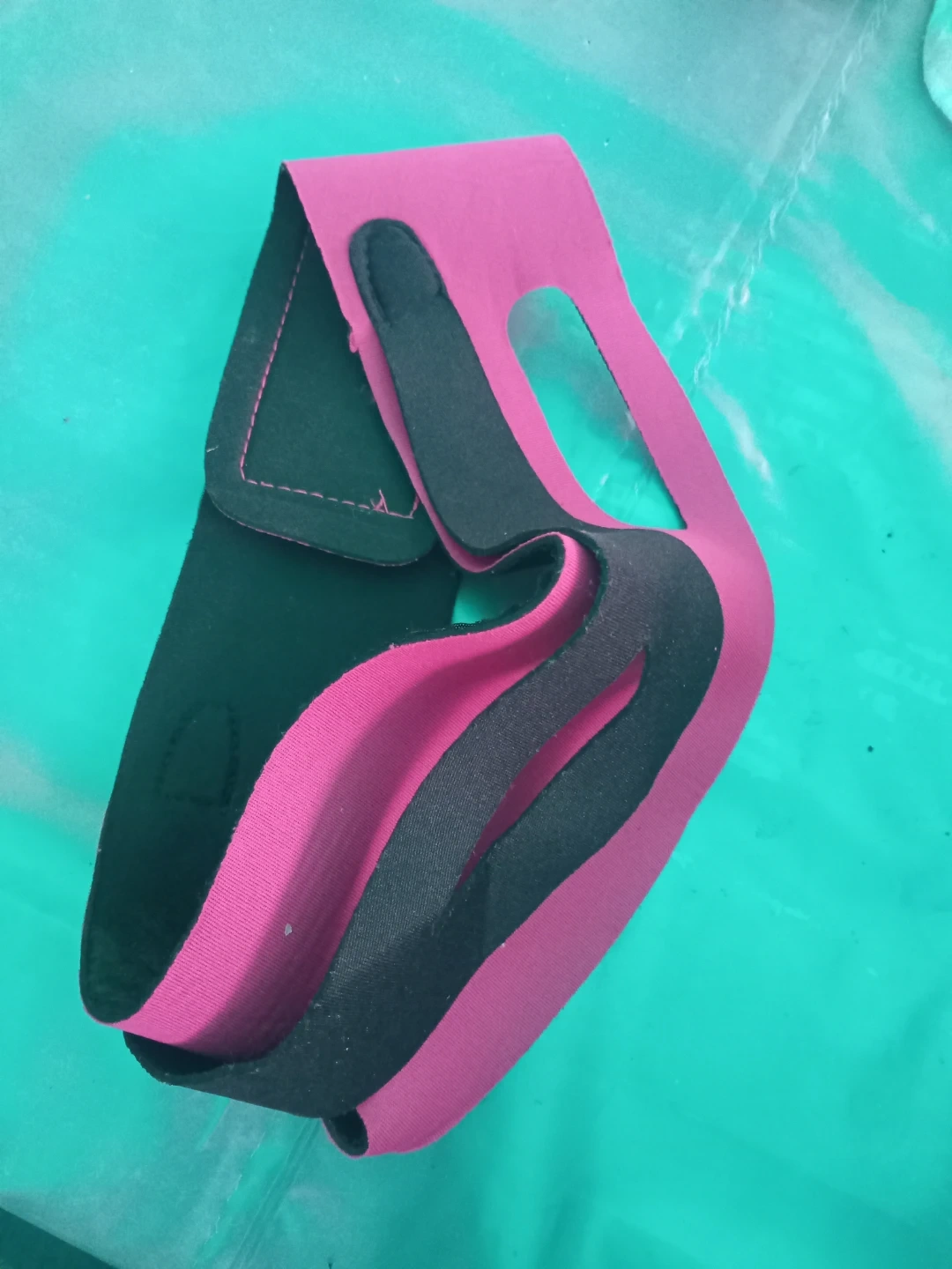 This is a pink and black chin support strap. It appears to be in good condition and could be used for various purposes, such as providing support during sleep or recovery. It is made of a soft, flexible material for comfortable wear