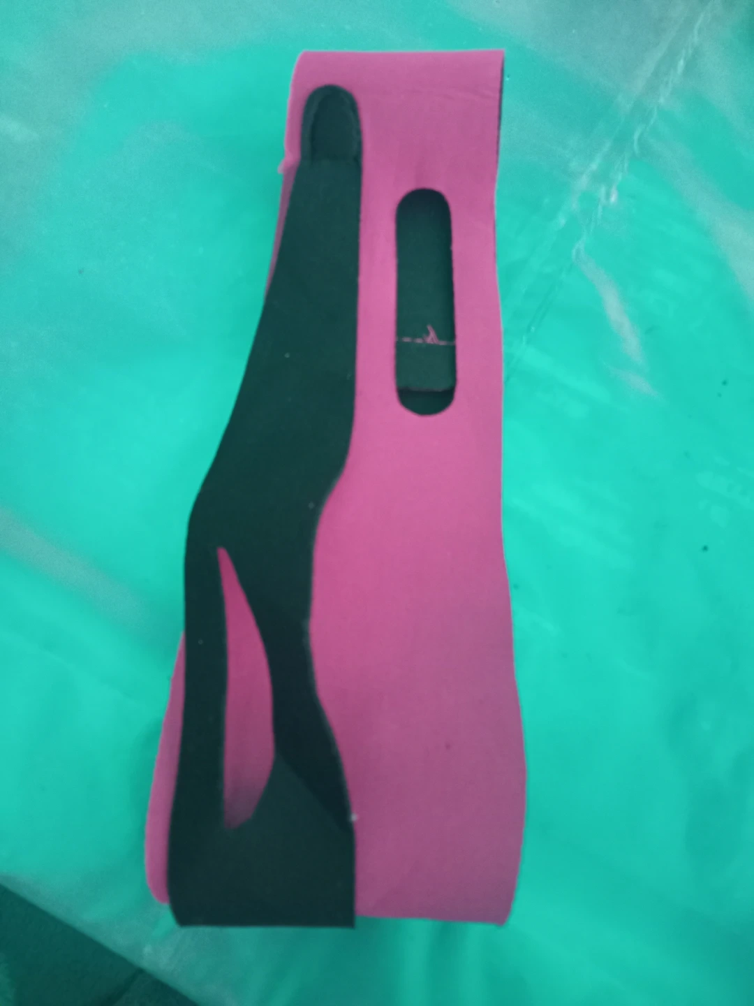 This is a pink and black chin support strap. It appears to be in good condition and could be used for various purposes, such as providing support during sleep or recovery. It is made of a soft, flexible material for comfortable wear