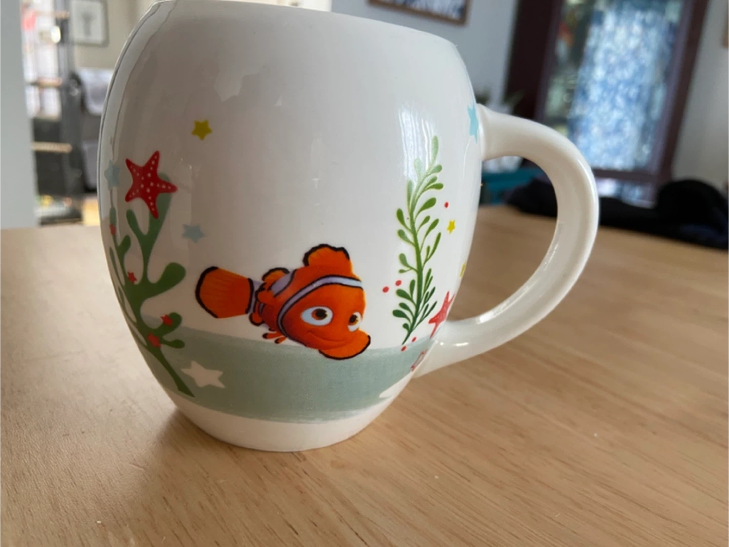 White ceramic mug featuring characters from Finding Nemo and Finding Dory, including Dory and Nemo. It's got fun underwater graphics. This mug is perfect for enjoying your morning coffee or tea!