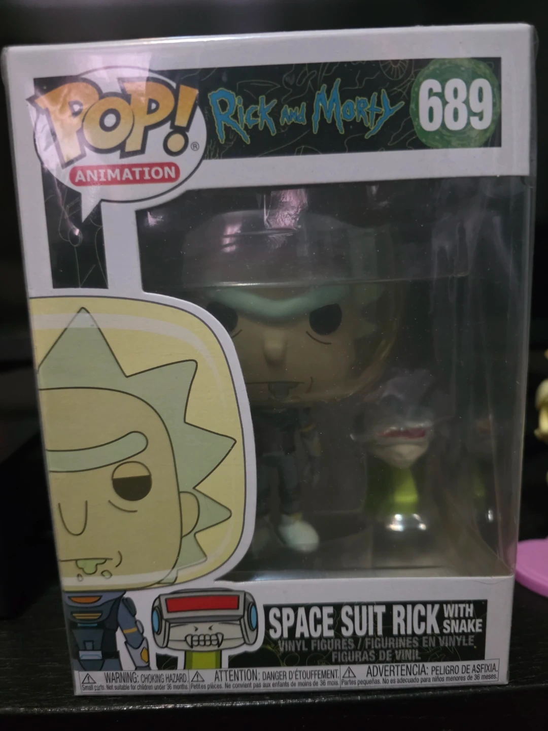 This is a Funko Pop! Vinyl figure of Space Suit Rick with Snake from Rick and Morty. It's figure number 689 in the Animation series. The figure comes in its original packaging.