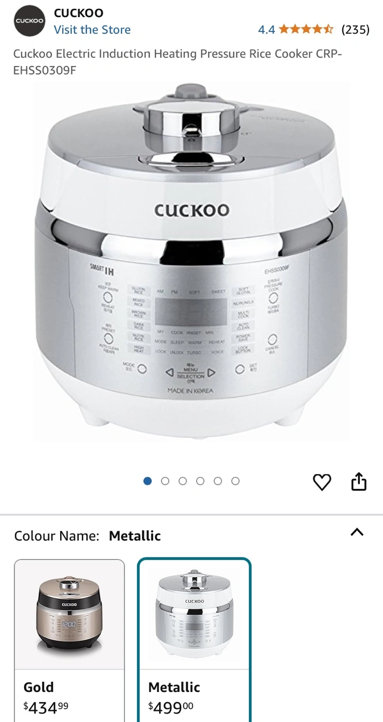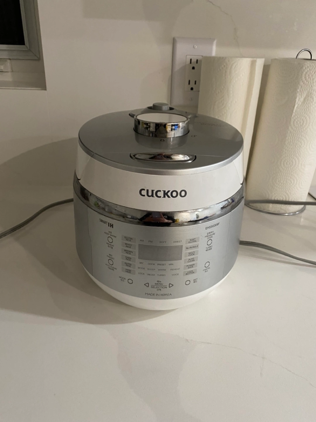Cuckoo Electric Induction Heating Pressure Rice Cooker. Metallic colour. Model CRP-EHS0309F. Features multiple cooking functions. Made in Korea. 3cups