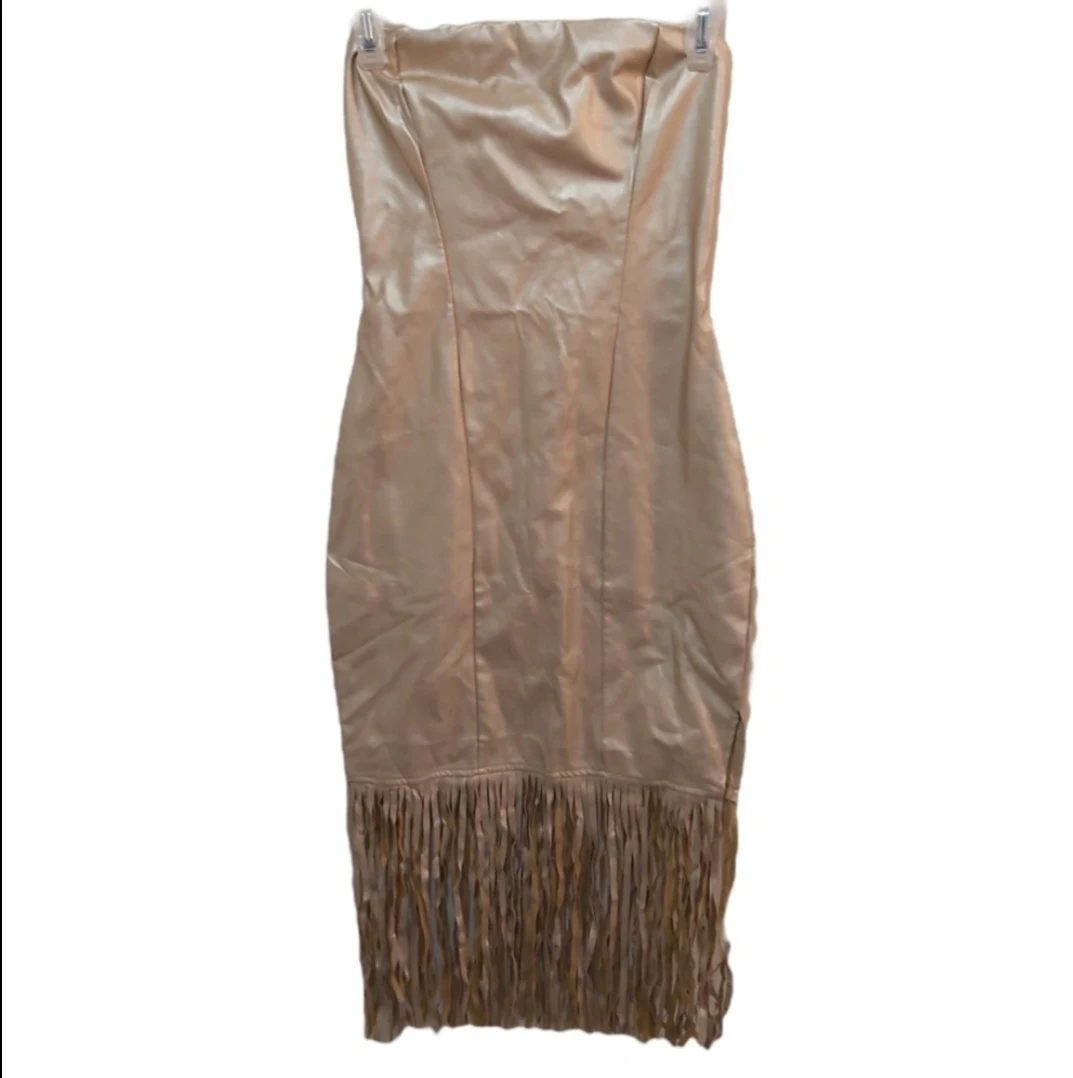 - Symphony gold strapless dress with fringe on the bottom, size