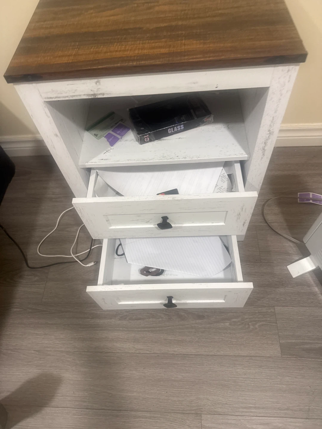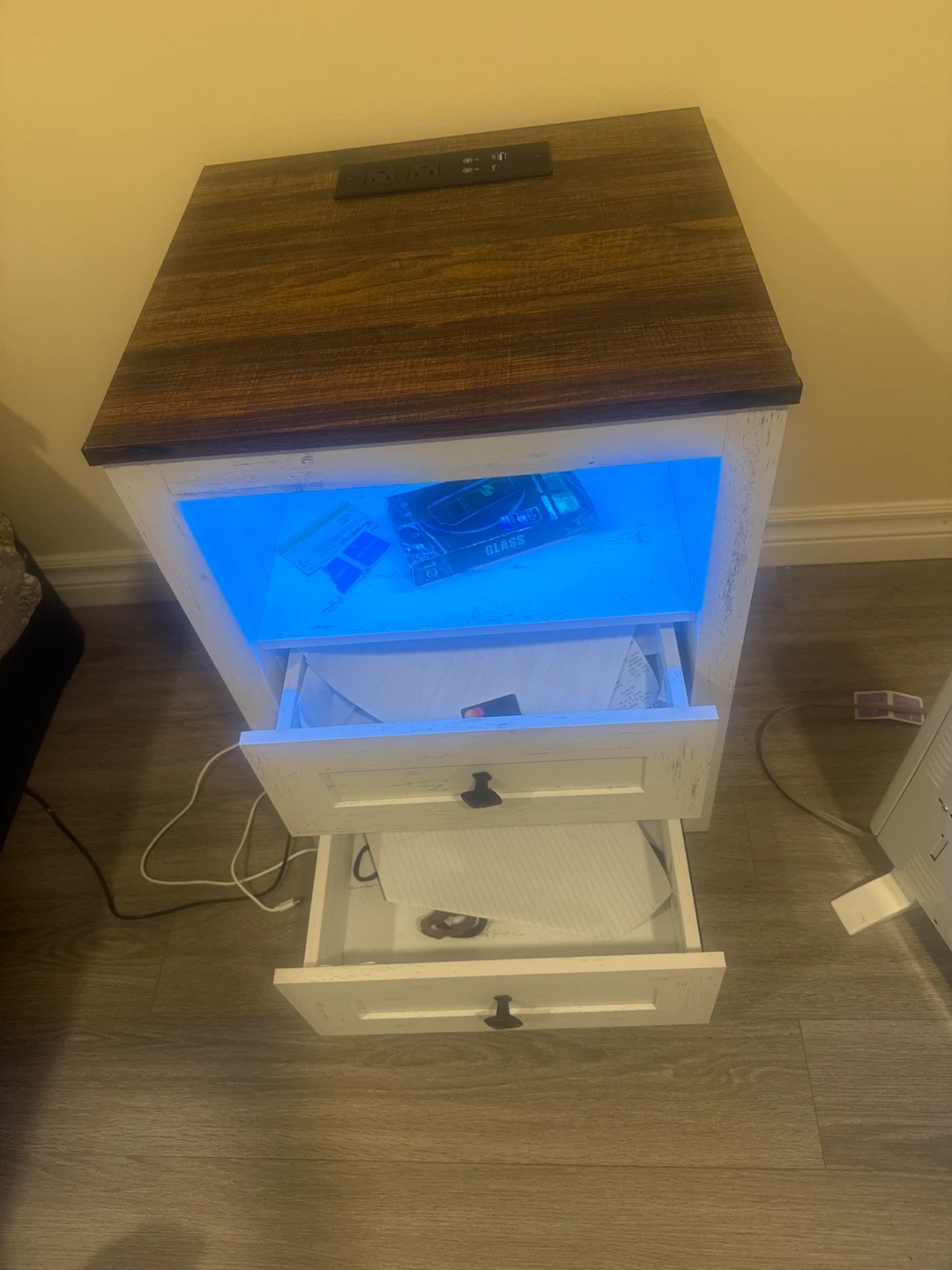 This rustic farmhouse-style nightstand features a distressed white finish and a wood-tone top. It has two drawers and an open shelf with blue LED accent lighting. The top also includes a built-in power strip with USB ports for convenient charging. It's perfect for bedside storage and keeping your devices powered up!