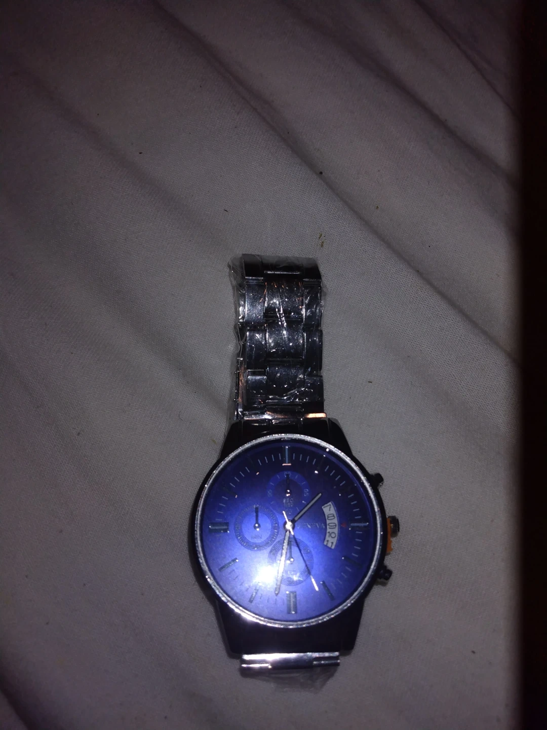 Selling a men's watch with a striking blue face and a silver-tone band. It features chronograph subdials and a date display. The watch is in mint condition, ready to wear.