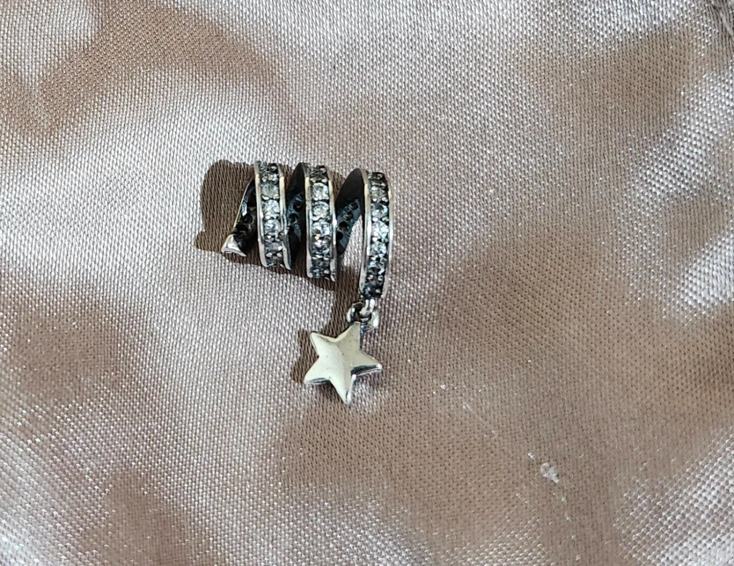 Add a touch of celestial sparkle to your bracelet with this sterling silver charm. It's designed as a spiral with clear cubic zirconia stones and a dangling star. This charm is perfect for adding a personal touch to your bracelet!