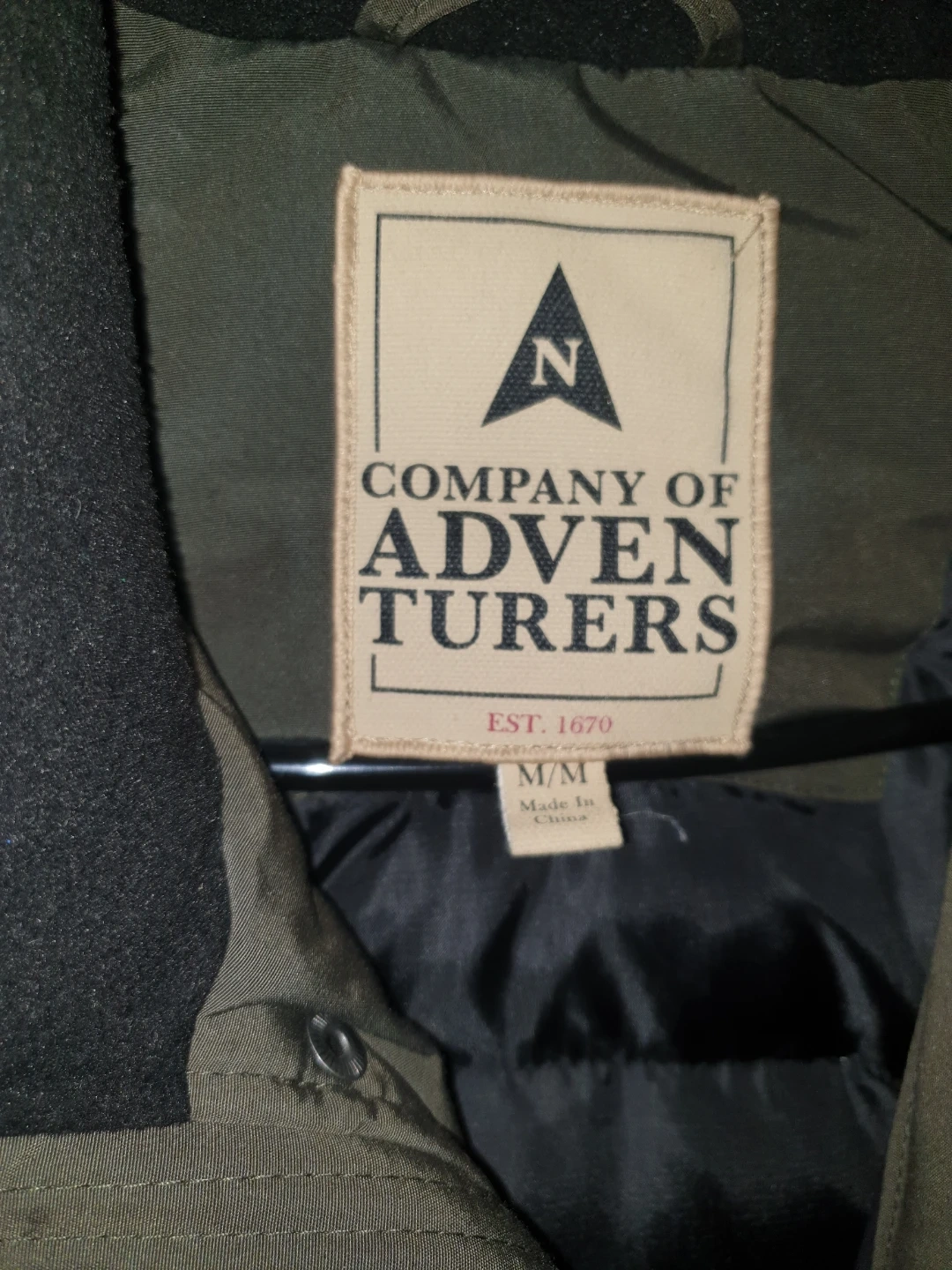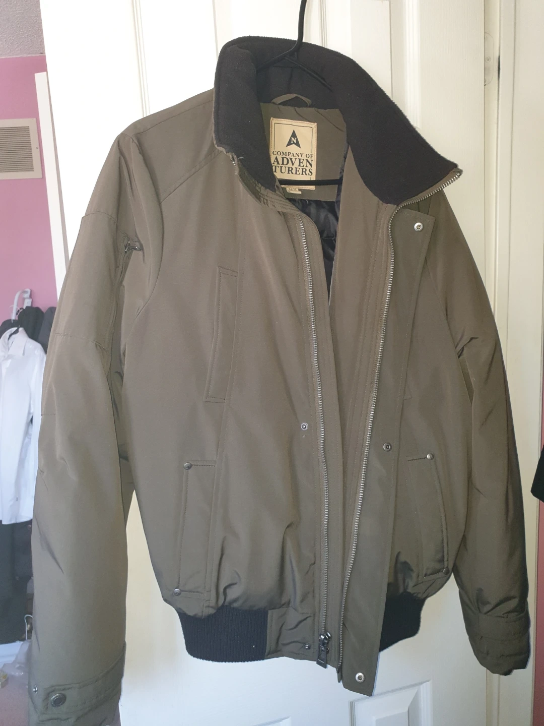 Company of Adventurers bomber jacket in olive green. It's a size medium. Jacket has a full zip front and ribbed cuffs and hem.