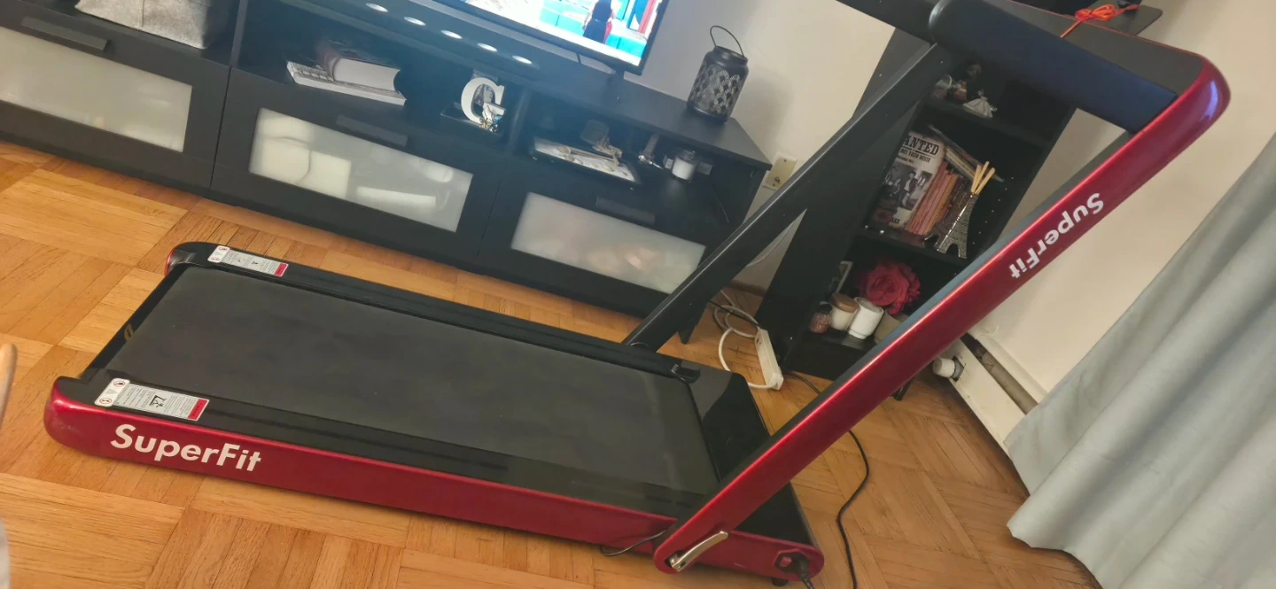 SuperFit foldable treadmill for home use. It's red and black with a black running belt. This treadmill is great for getting your steps in, especially during colder months!