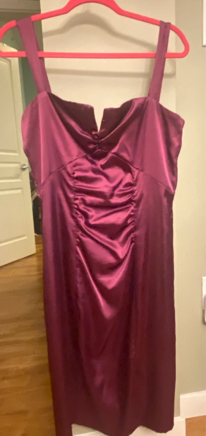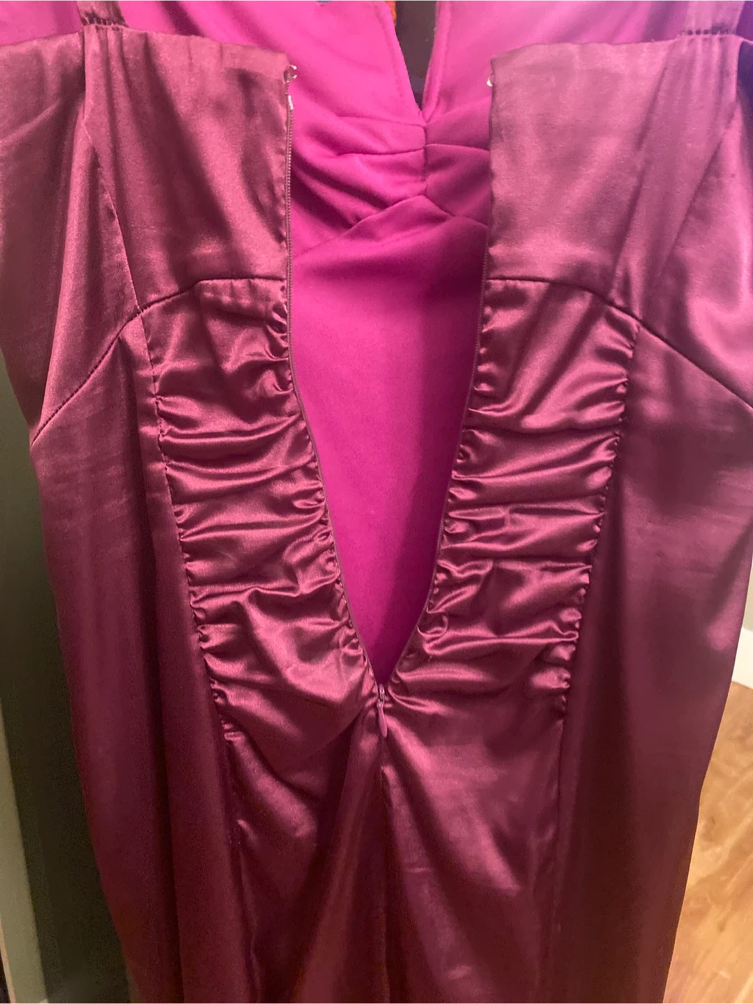 MADE IN CANADA. Burgundy or wine or Raspberry colour. only worn twice to special events. No rips or frays. Zipper fully functional and in tact. Great for a wedding guest or bridal party, prom or any special occasion. Also includes plastic cover and hanger.