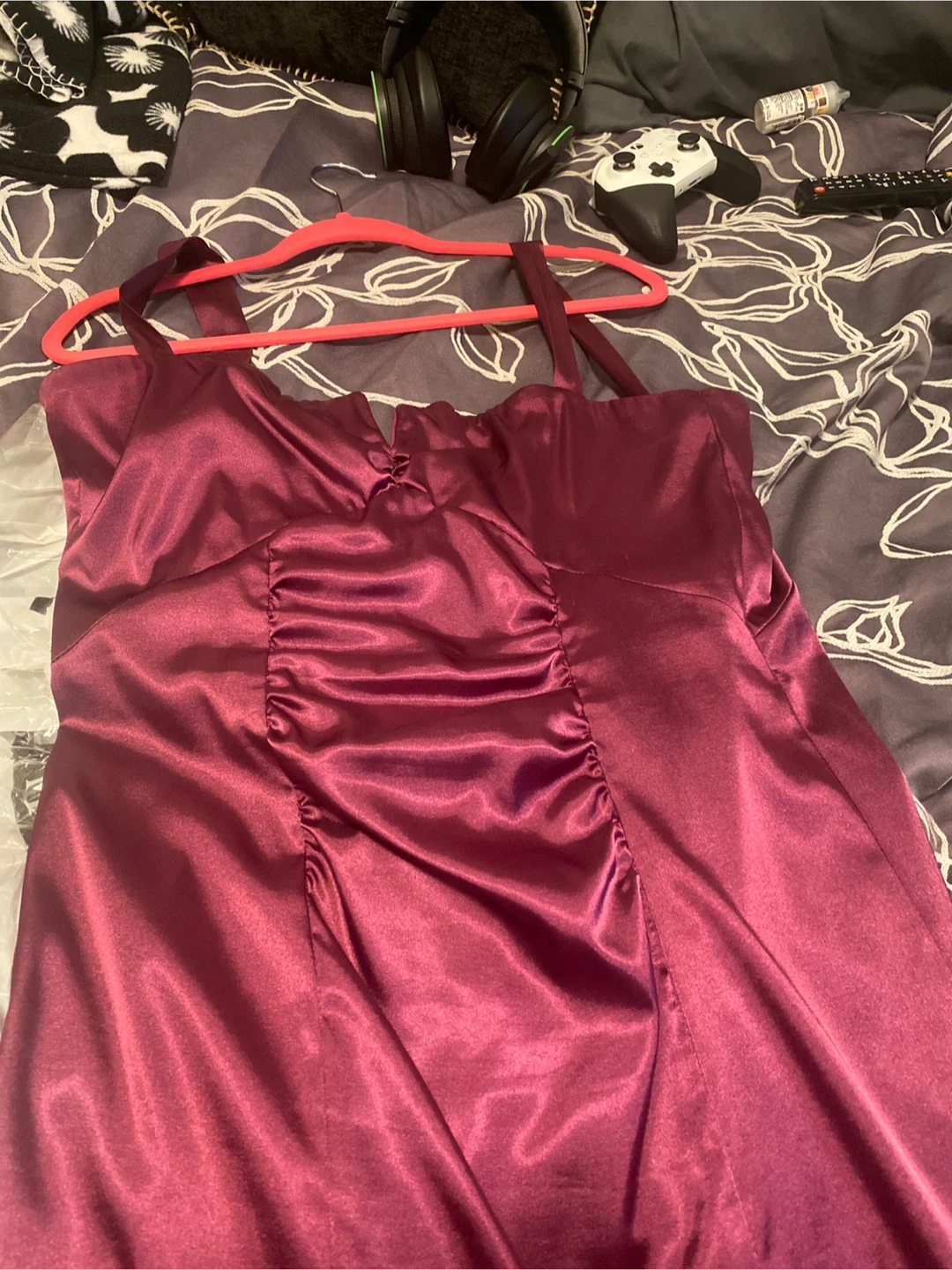MADE IN CANADA. Burgundy or wine or Raspberry colour. only worn twice to special events. No rips or frays. Zipper fully functional and in tact. Great for a wedding guest or bridal party, prom or any special occasion. Also includes plastic cover and hanger.