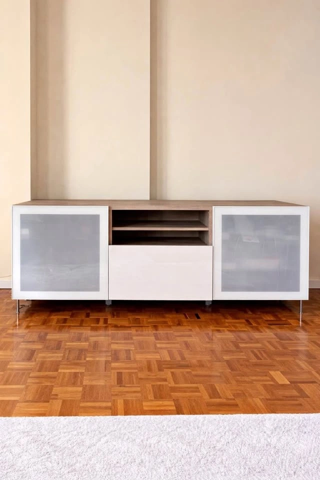 Size: 70 7/8" x 16 1/2" x 29 1/8". Finish: Walnut effect light gray with Selsviken/Stallarp high-gloss and white frosted glass fronts. Like new condition and includes all original manuals. Stylish, modern, and offers great storage for media and accessories.