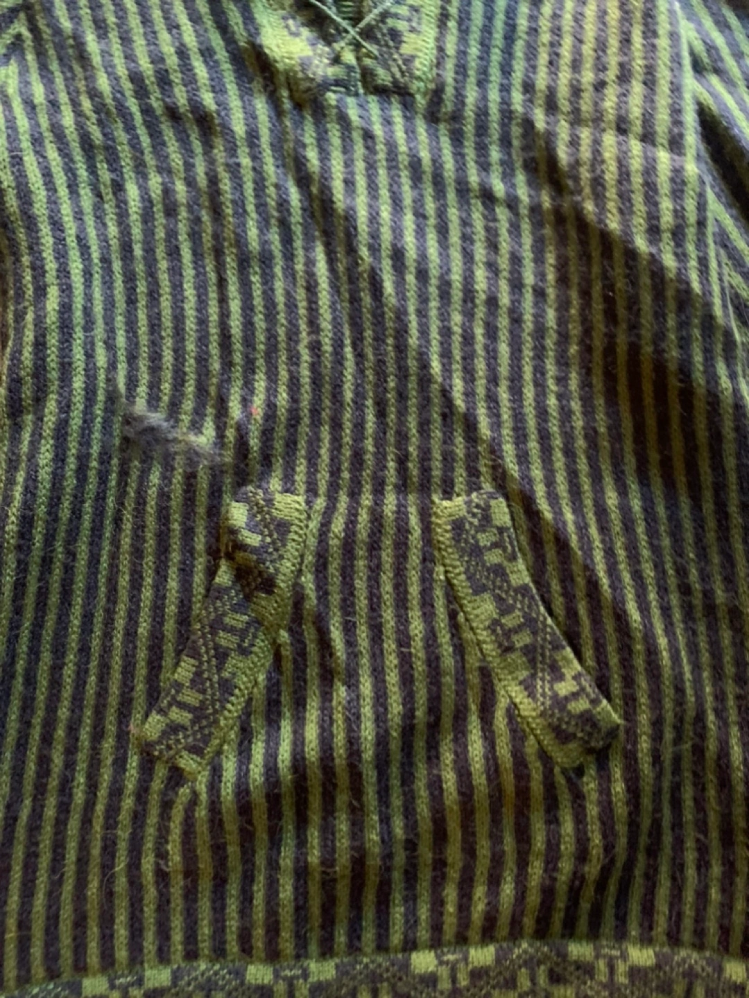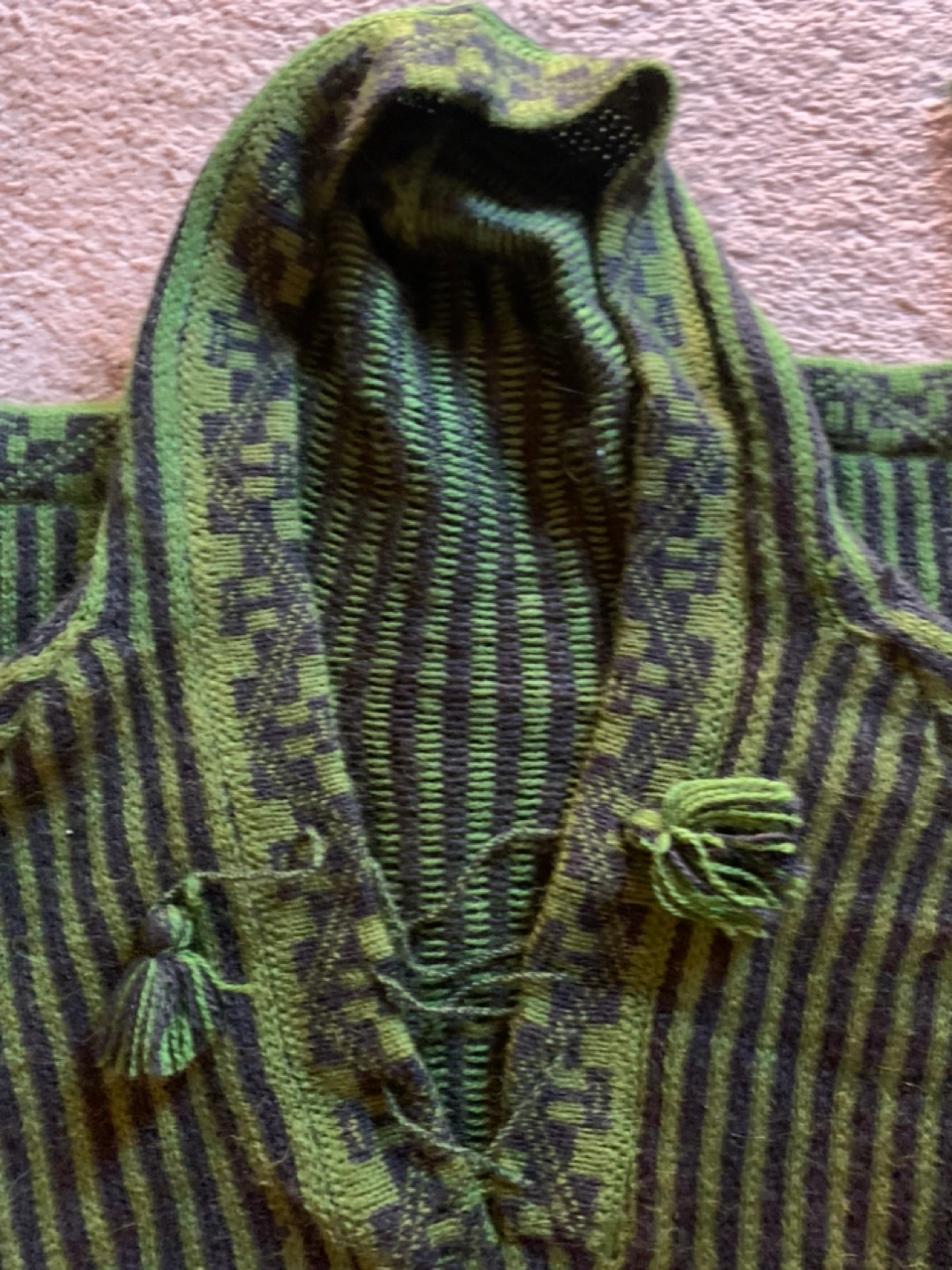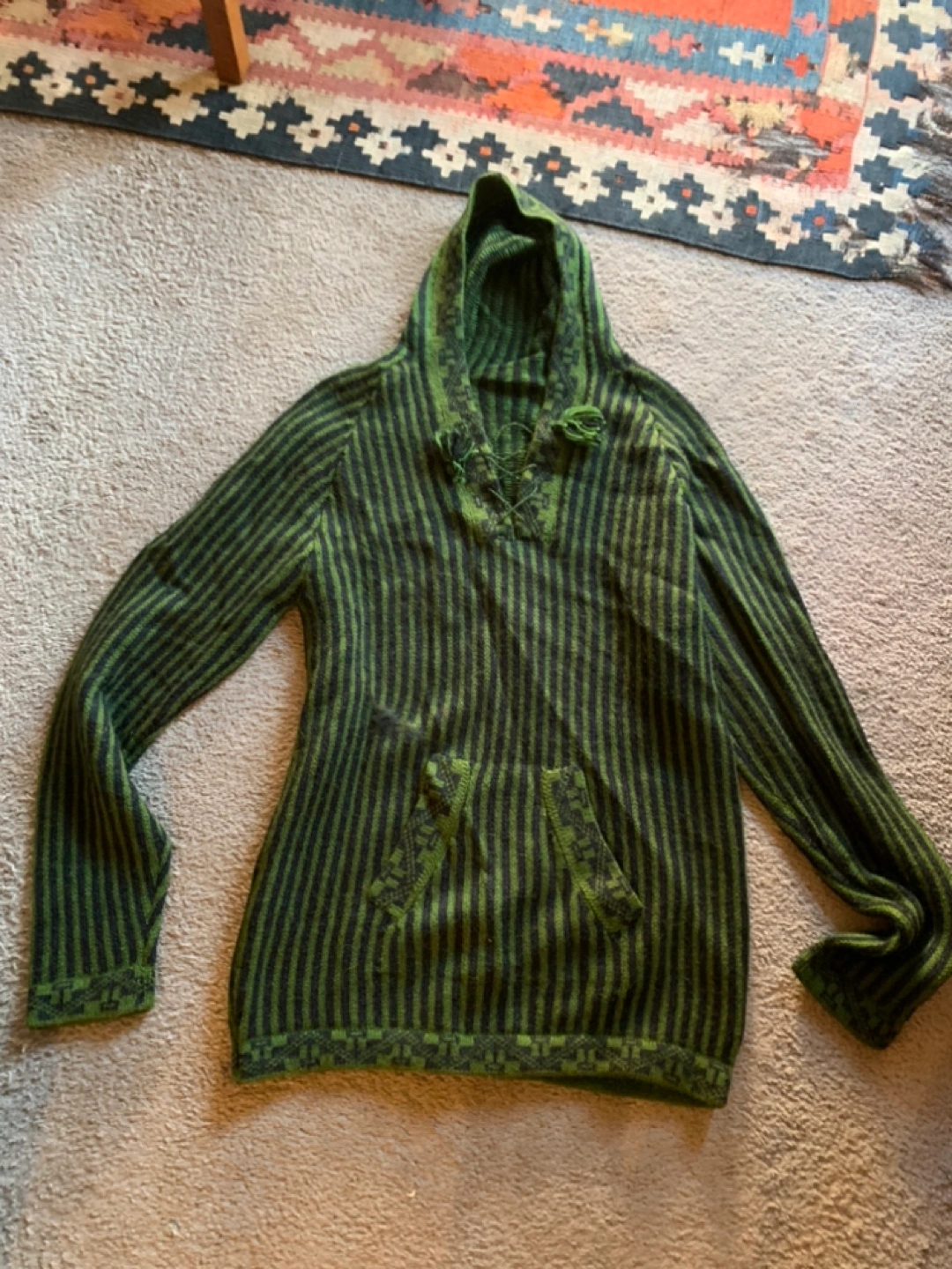 Green and black striped alpaca hoodie with a hood and pockets. It has a lace-up detail at the neckline and tassels at the hood.