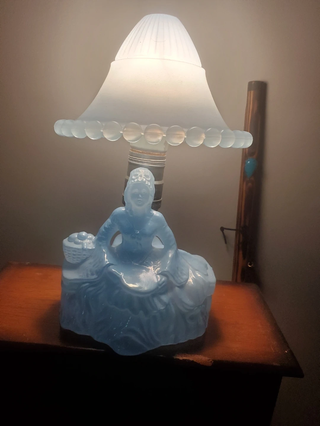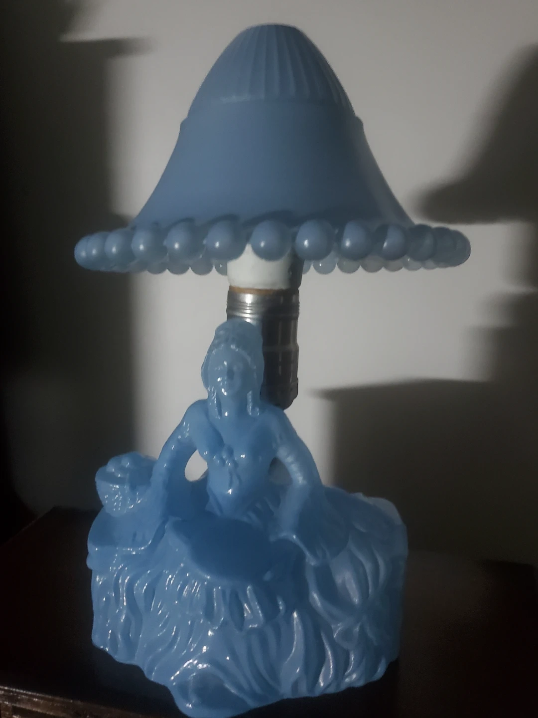 A charming blue glass table lamp featuring a figural lady at its base. The lampshade has a decorative beaded edge. It's a lovely accent piece for any room!