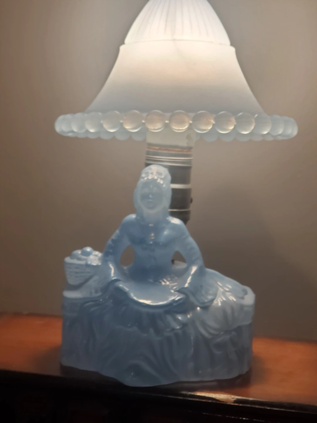 A charming blue glass table lamp featuring a figural lady at its base. The lampshade has a decorative beaded edge. It's a lovely accent piece for any room!
