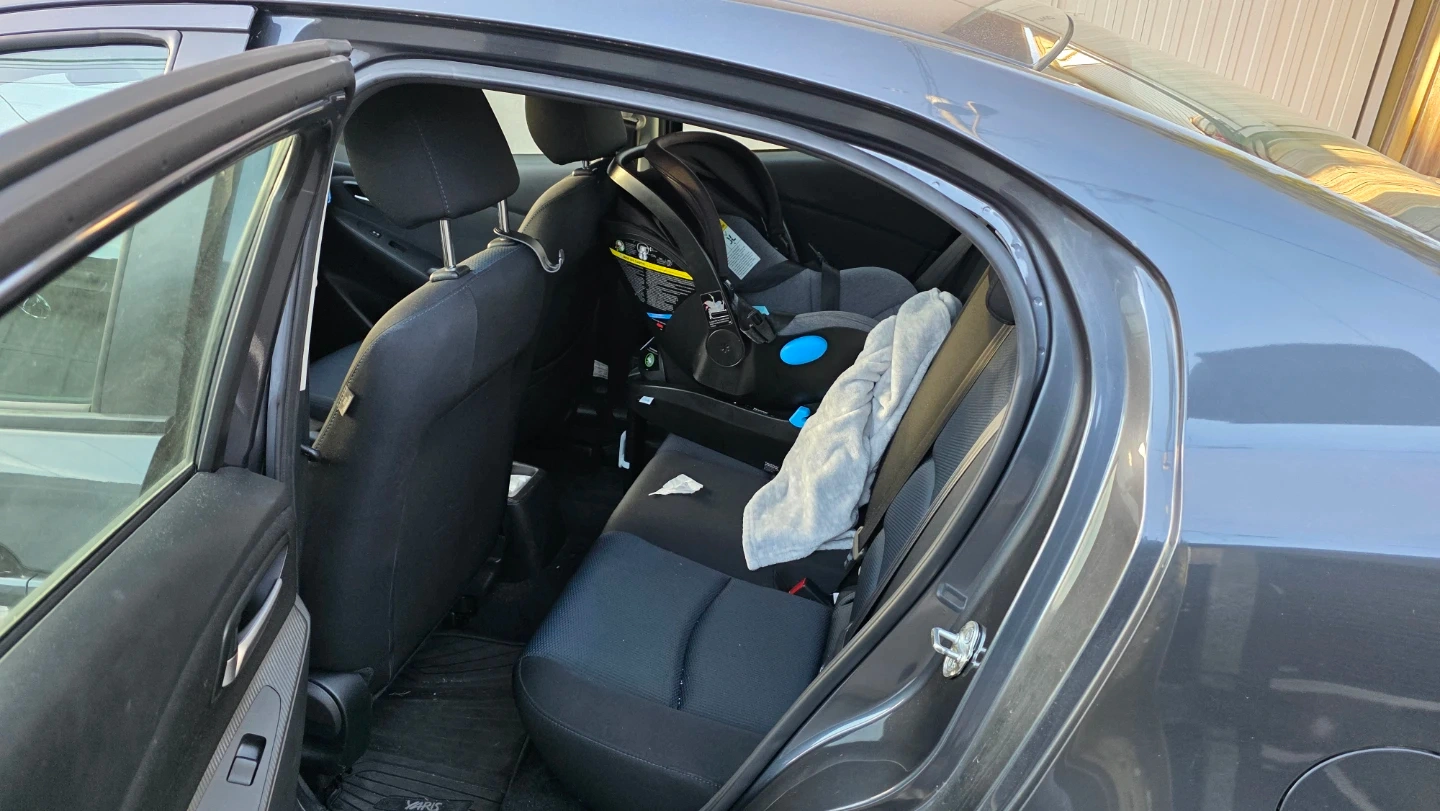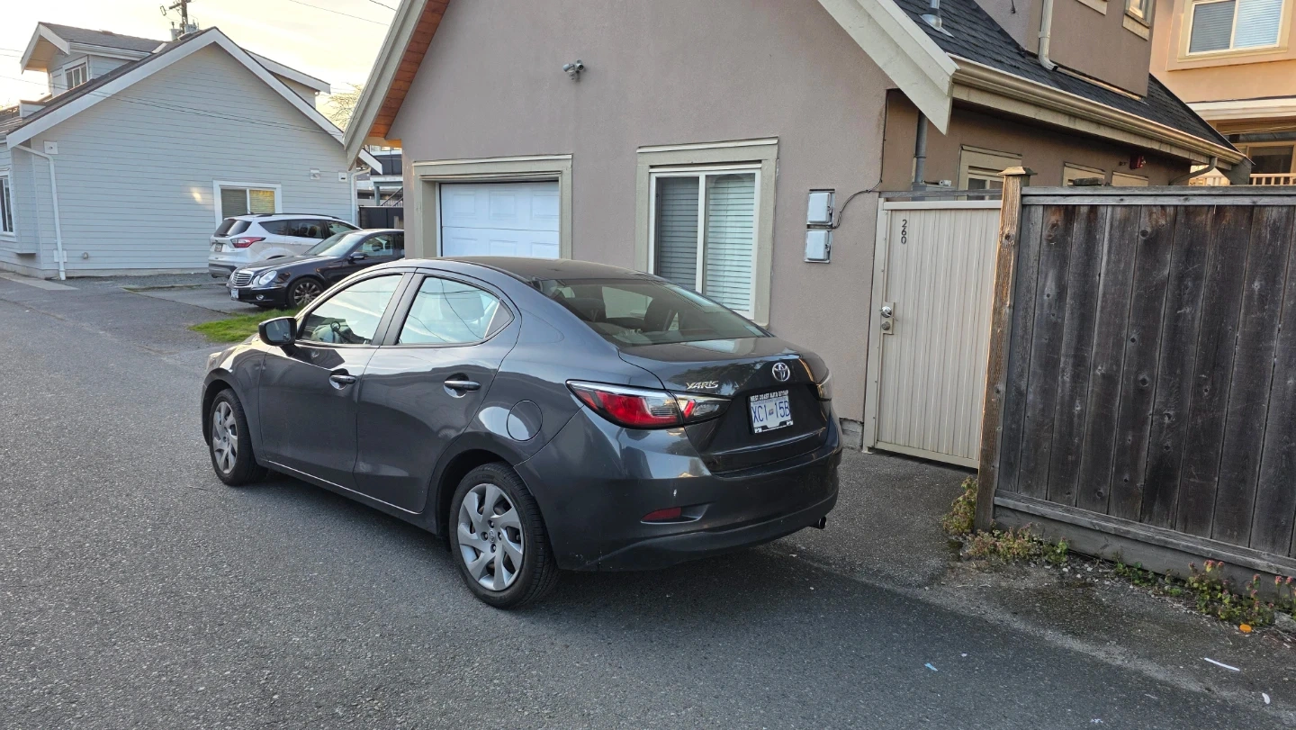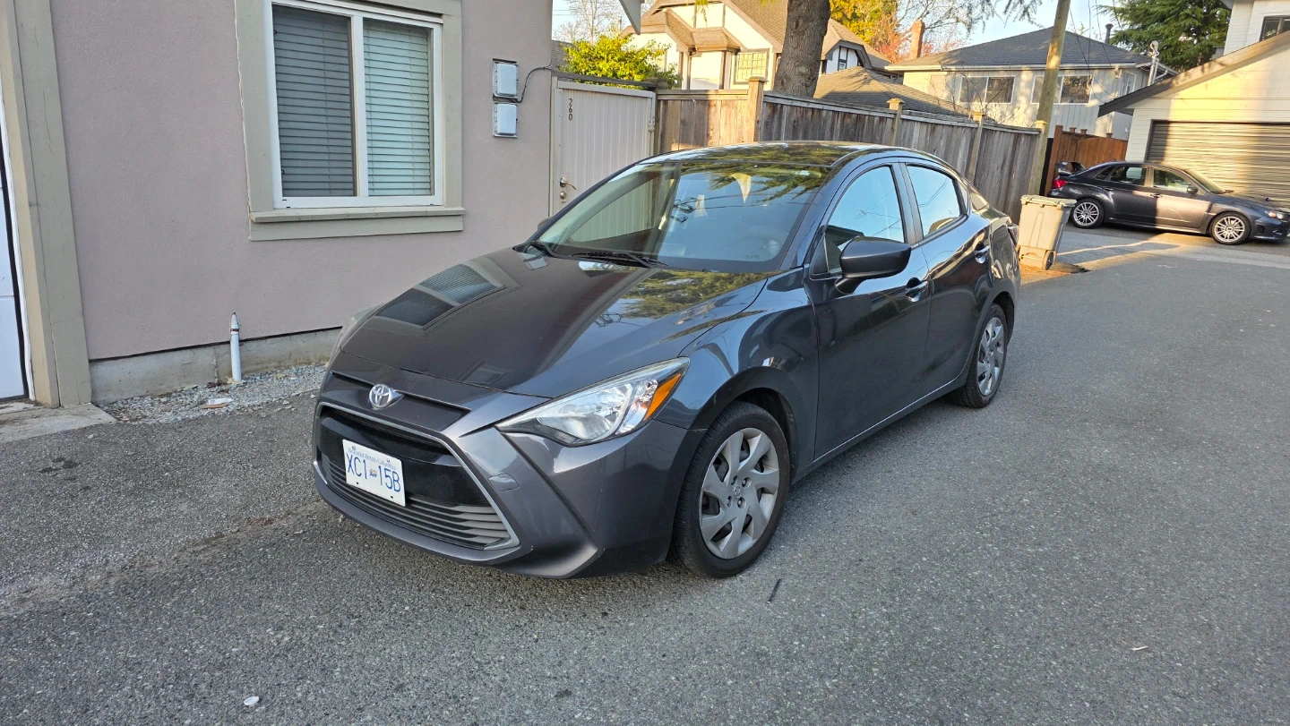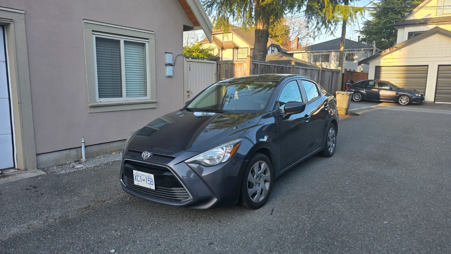 Dark grey 2016 Toyota Yaris sedan. This car has a 1.5L engine and automatic transmission. It's currently at 114,043 km. Interior is black cloth.