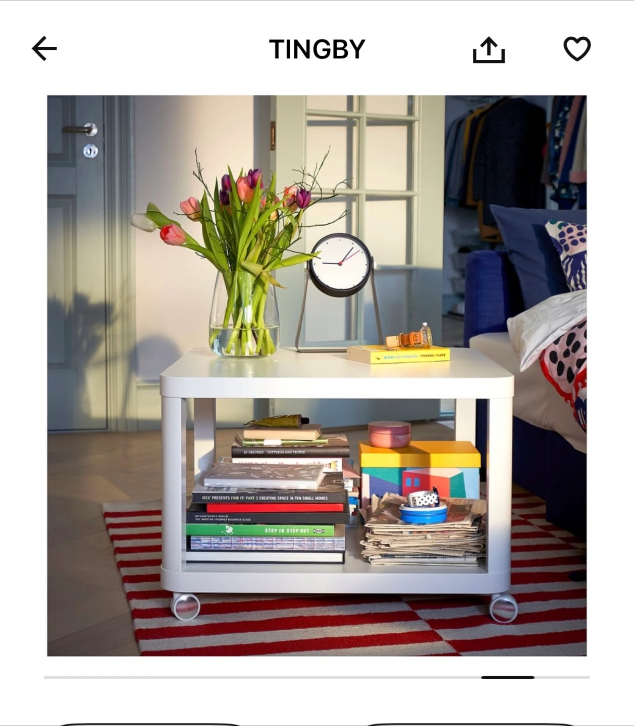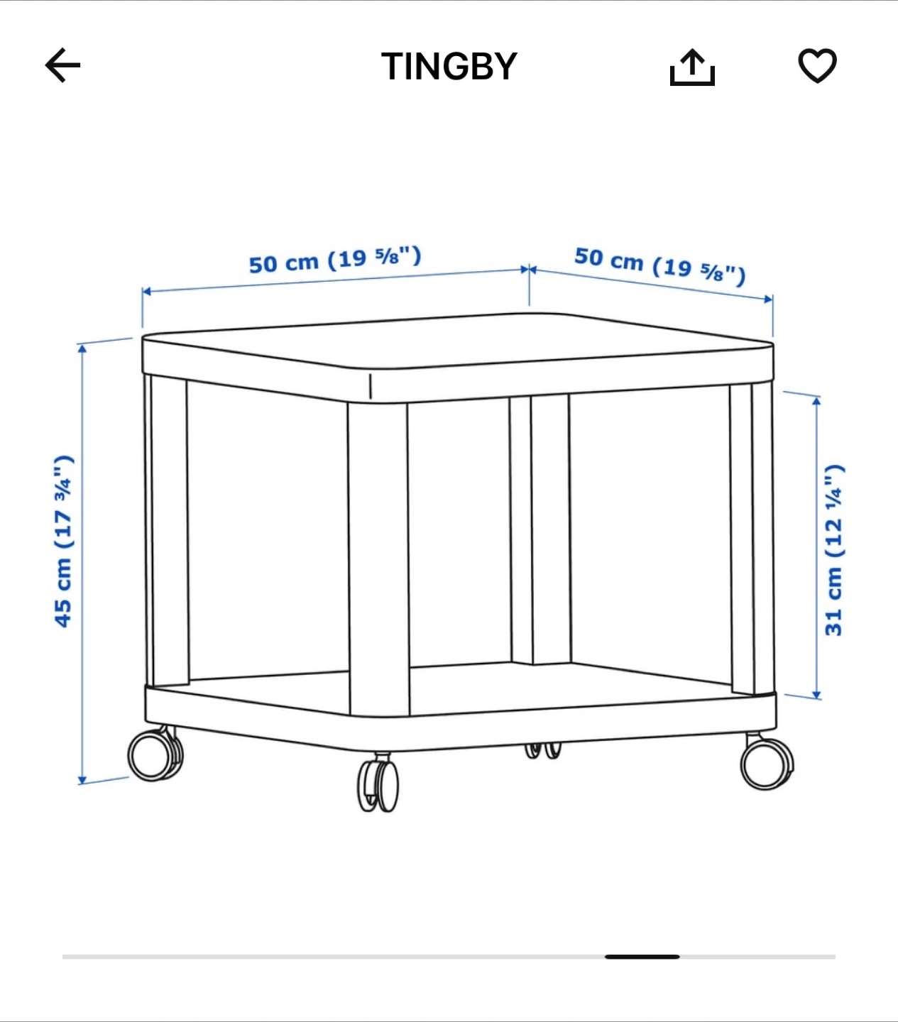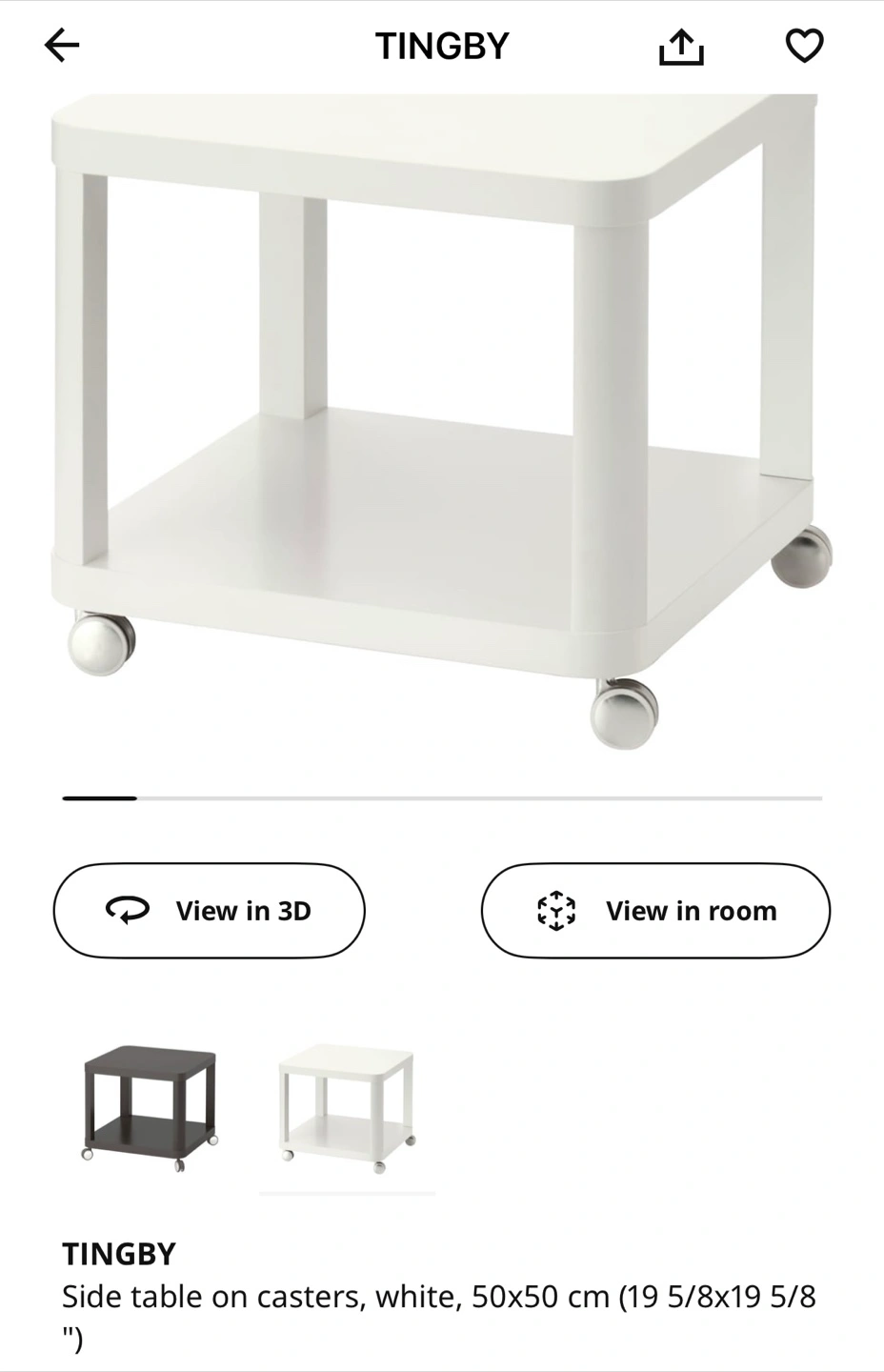 Selling a white IKEA TINGBY side table on casters! It's super handy and easy to move around. The dimensions are 50x50 cm (19 5/8x19 5/8 "). It's in great shape。