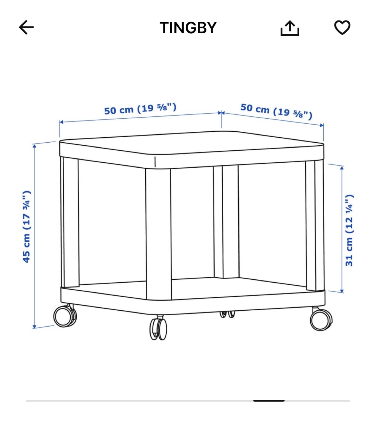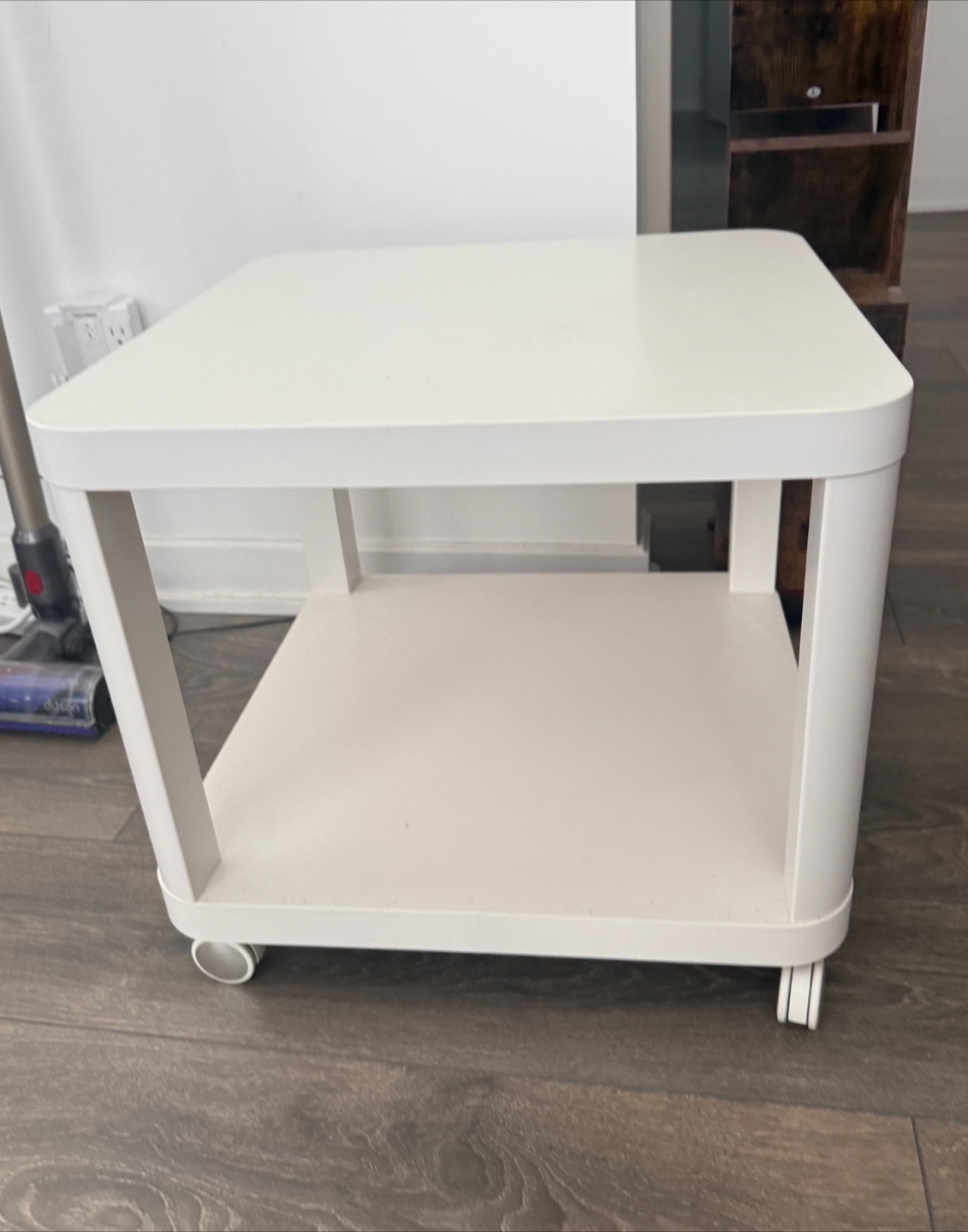 Selling a white IKEA TINGBY side table on casters! It's super handy and easy to move around. The dimensions are 50x50 cm (19 5/8x19 5/8 "). It's in great shape。