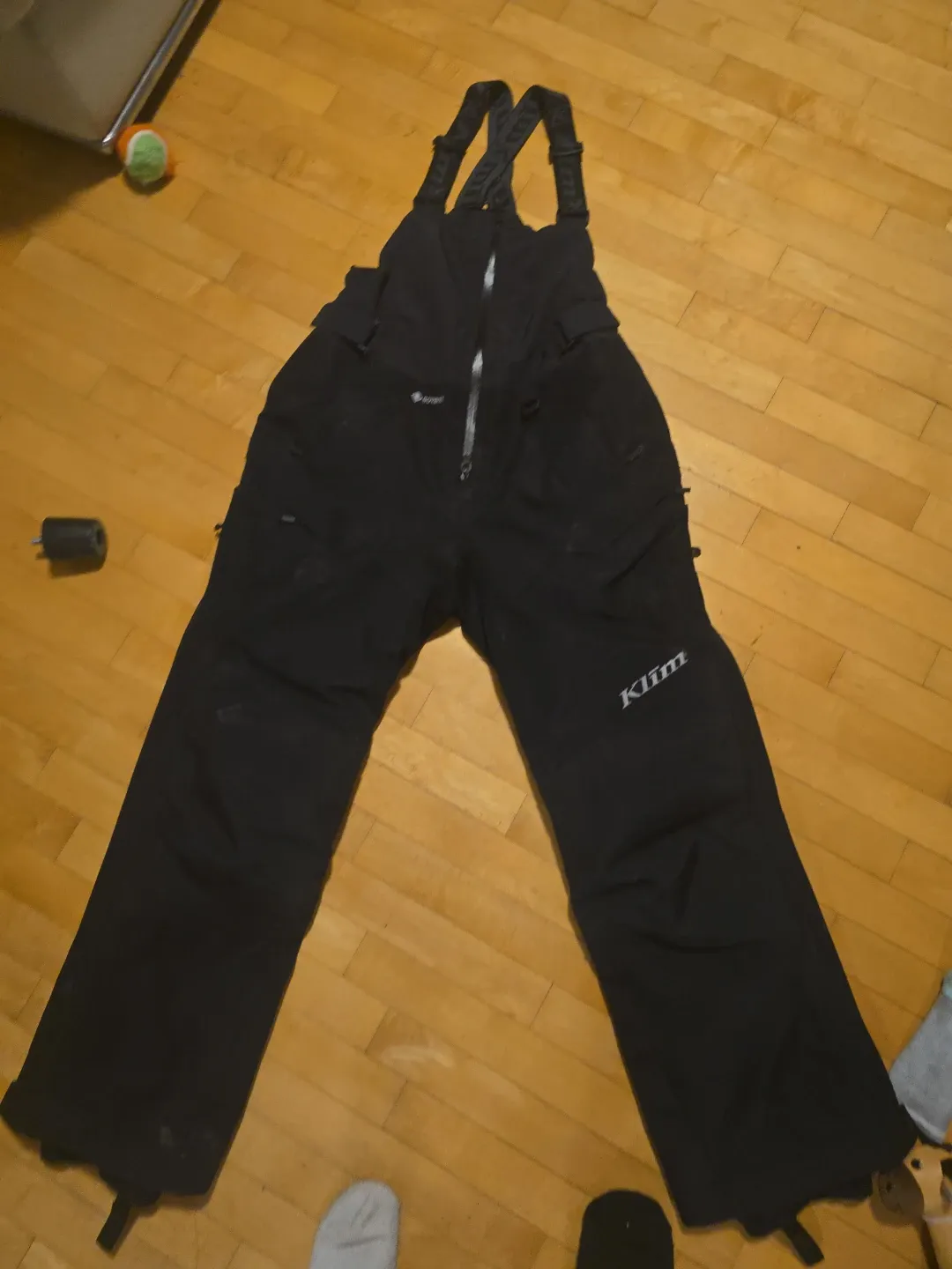 Klim black snowmobile bib pants. These are bib-style pants designed for cold weather activities. They feature adjustable suspenders and multiple pockets. Made with durable, waterproof material.