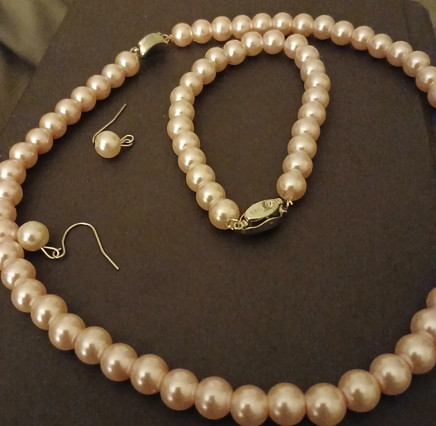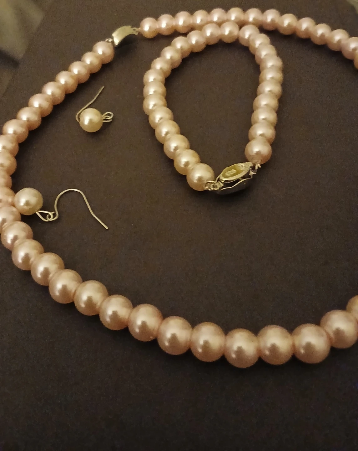 This is a classic pearl jewellery set. It includes a necklace, a bracelet, and a pair of earrings. The pearls are a lovely shade of cream. They're perfect for dressing up any outfit!