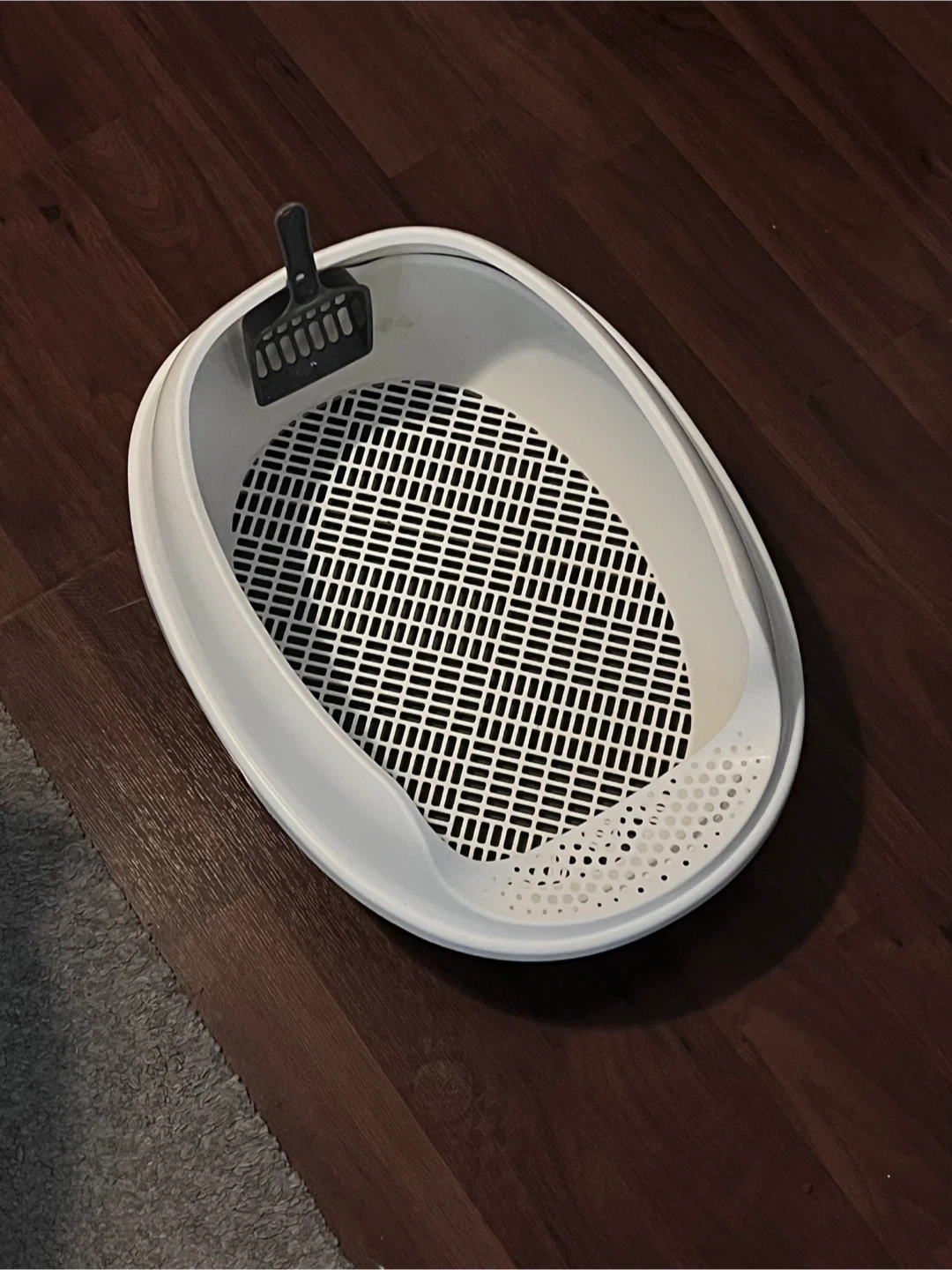 This is a two-piece cat litter box with a removable grate. It includes a matching scoop. Easy to clean and maintain your cat's litter area.
