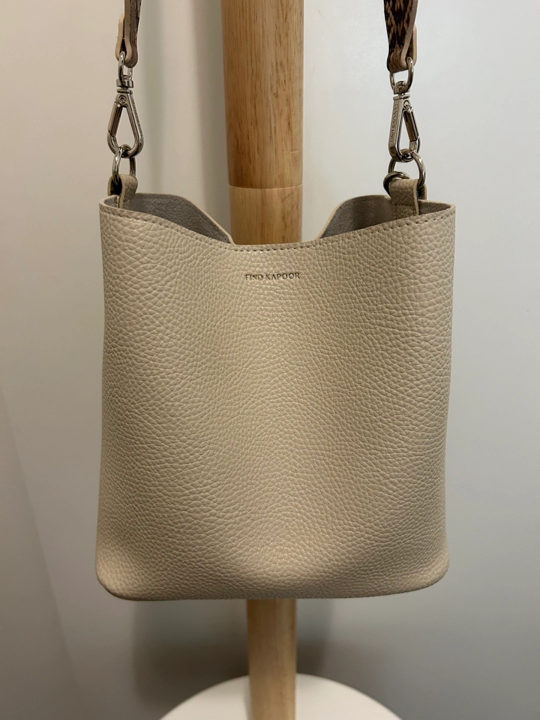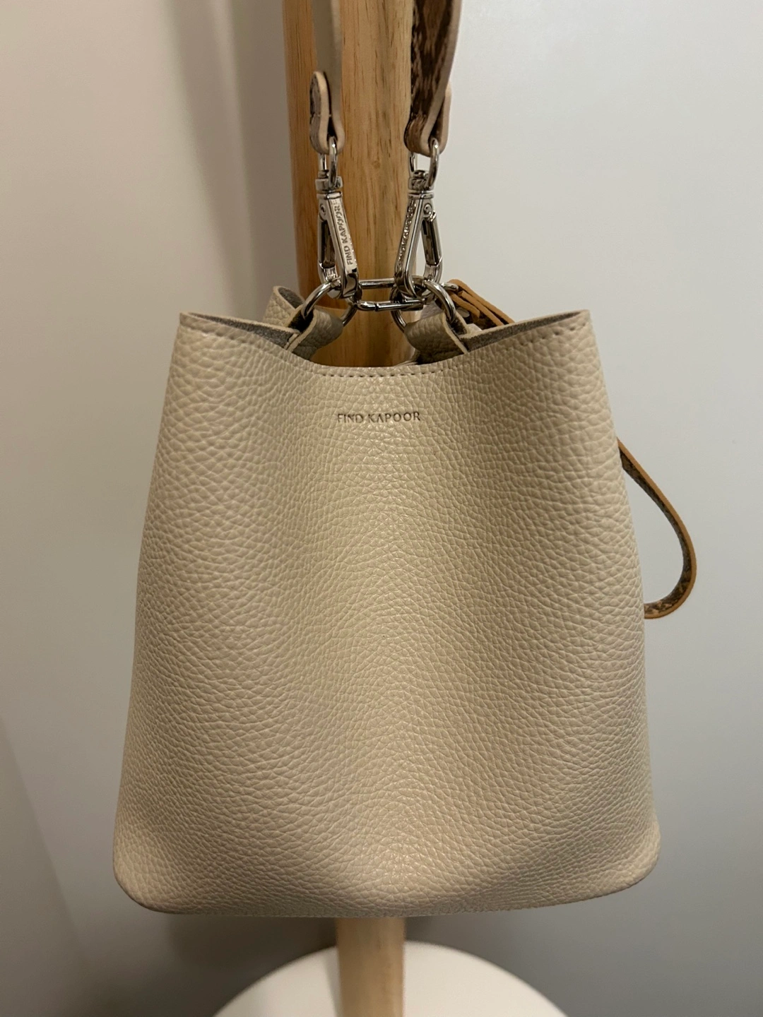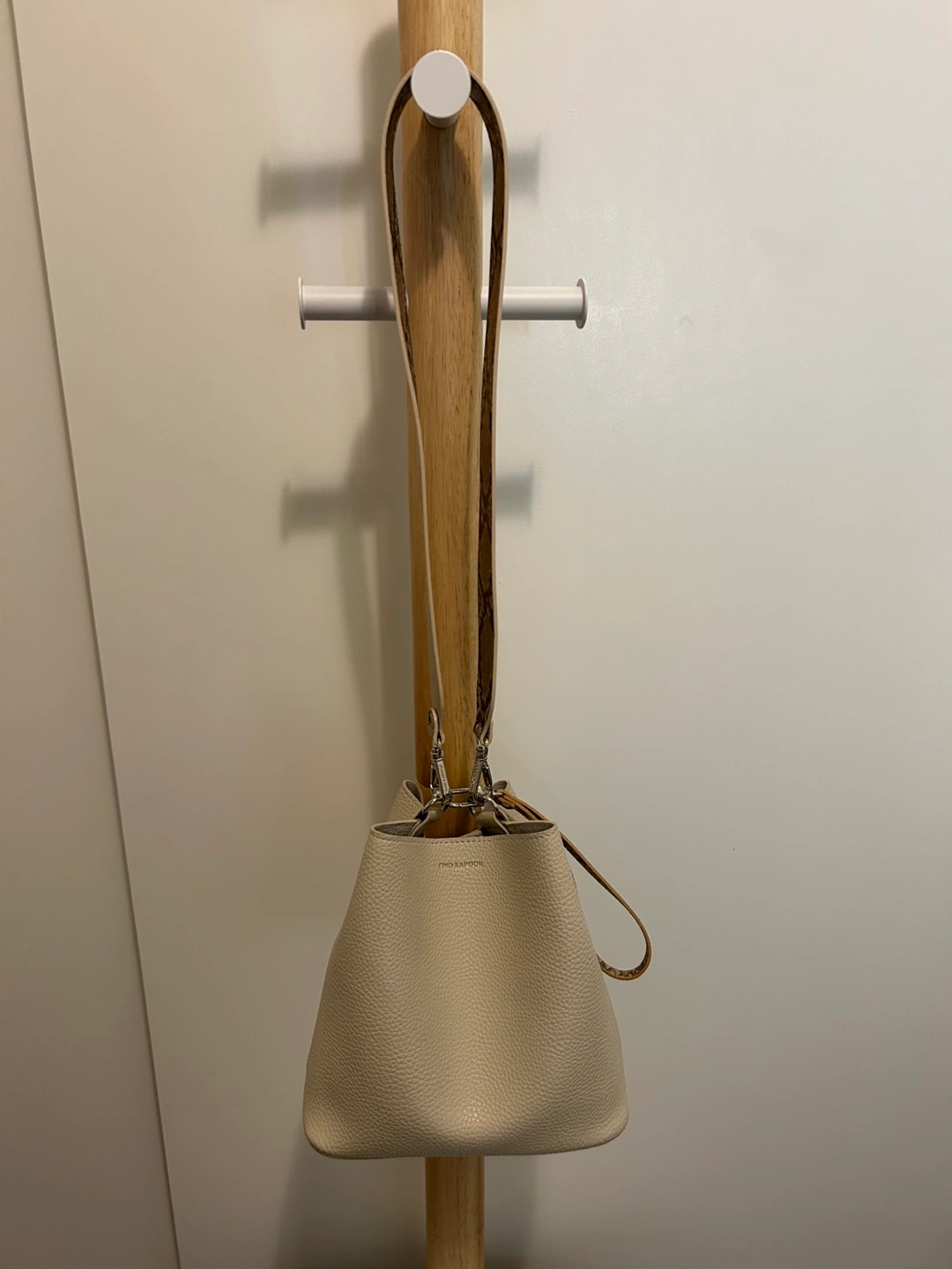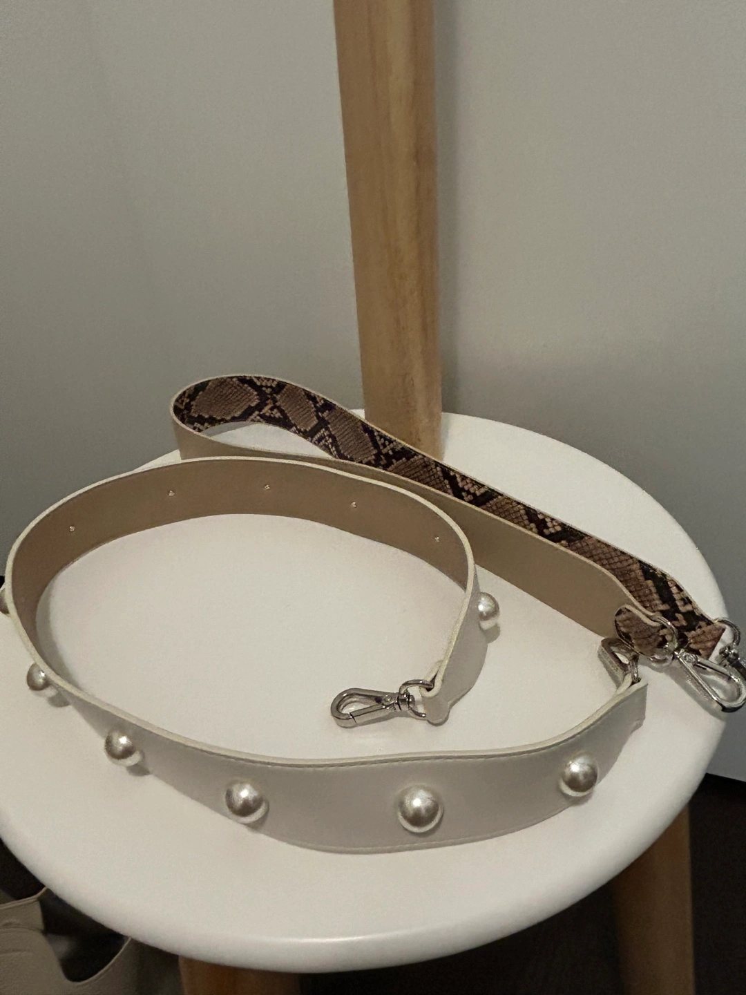 Find Kapoor (Korean brand) Pingo bag in ivory. Comes with two straps, one with a double sided beige/snakeskin pattern and the other with pearl studs.