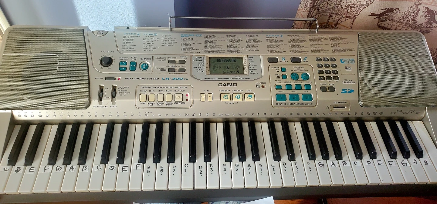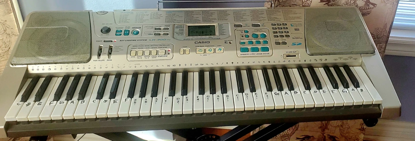 Casio LK-300TV electronic keyboard with a key lighting system. It has 61 keys and comes with an AC adapter. This keyboard is great for learning to play!