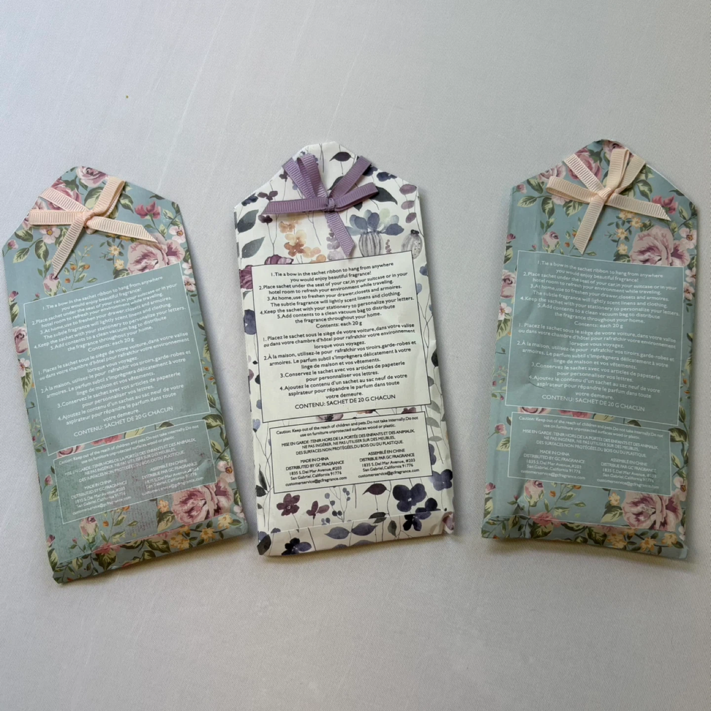 Set of three beautifully floral scented sachets by GC Fragrance featuring elegant floral designs and hanging ribbons. Perfect for freshening up closets, drawers, suitcases, or even your vehicle.
