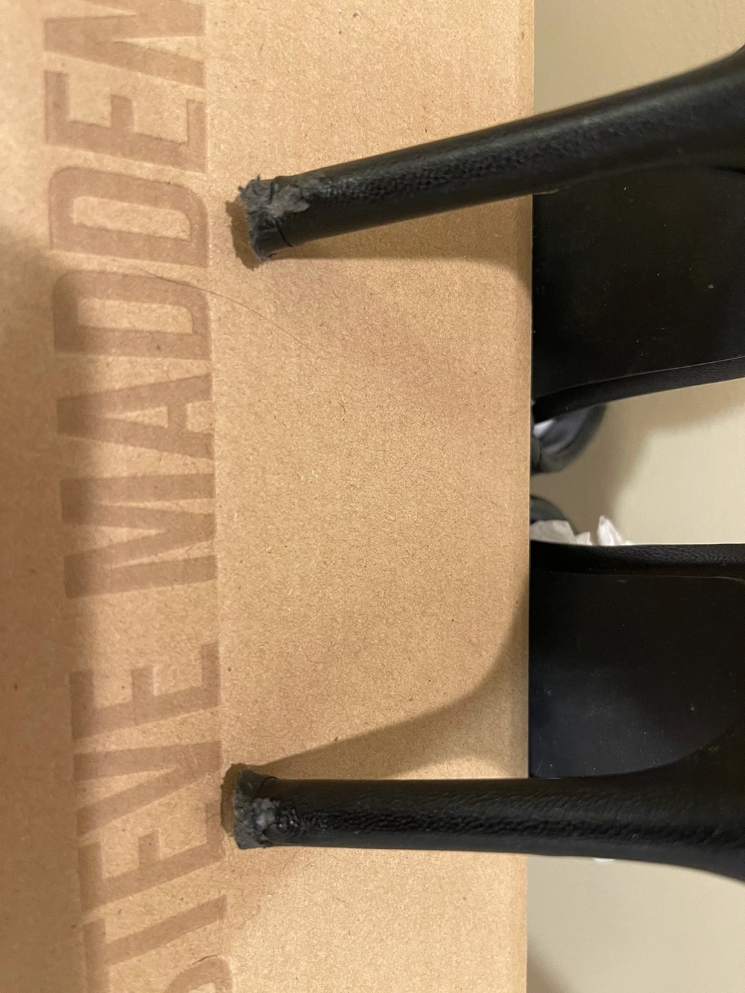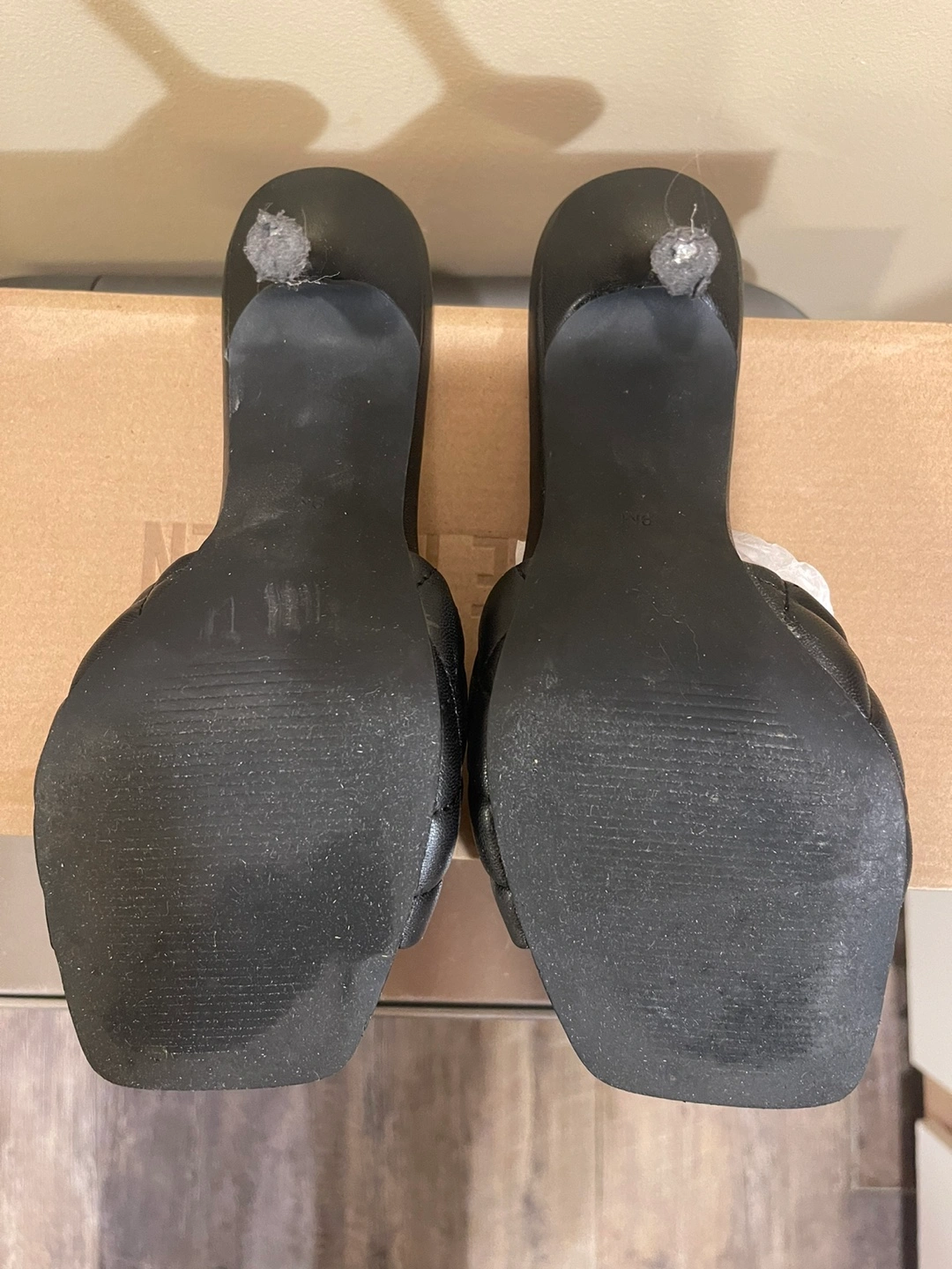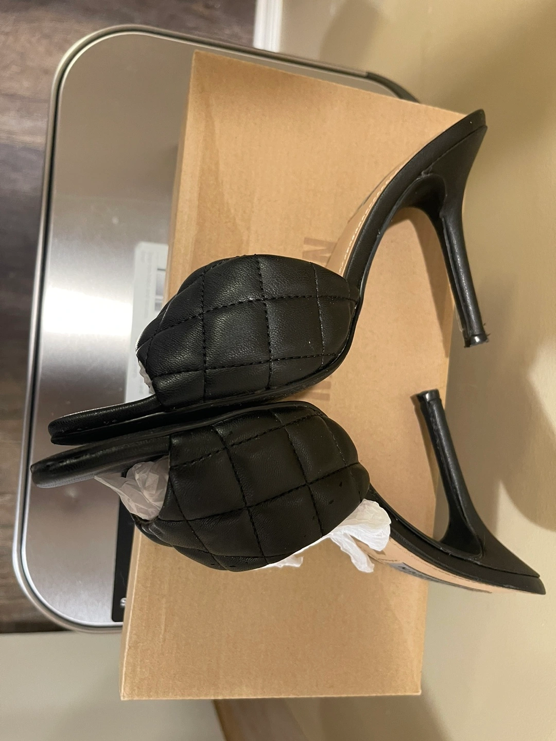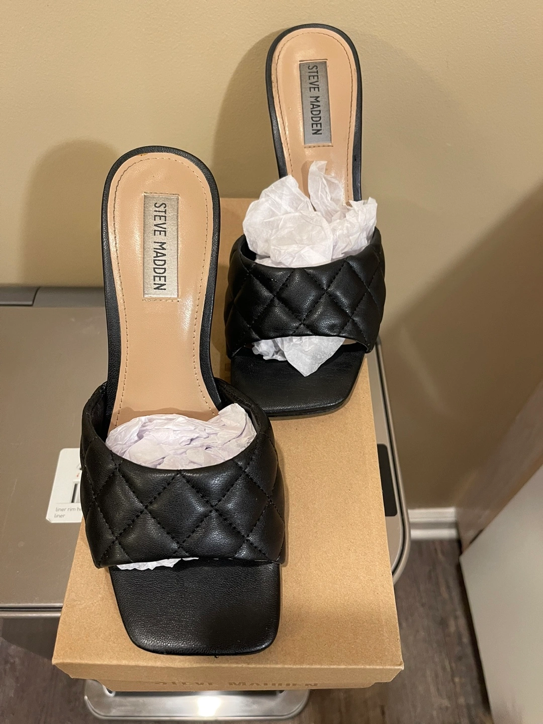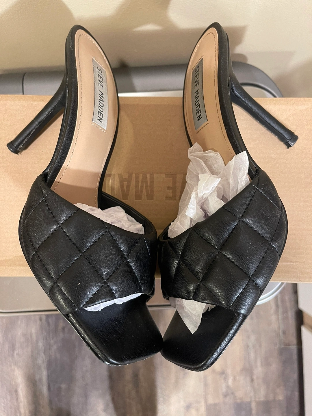 Black quilted heeled sandals. Square toe. Open toe. Heel height approximately 3 inches.
