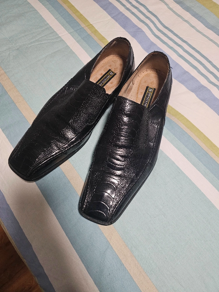Men's black leather slip-on shoes. Square toe. Embossed pattern. Good for formal occasions. Size 12