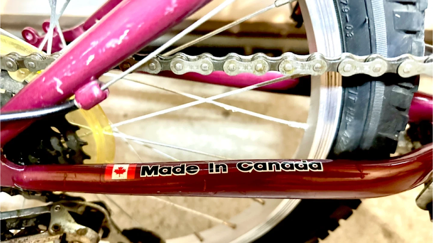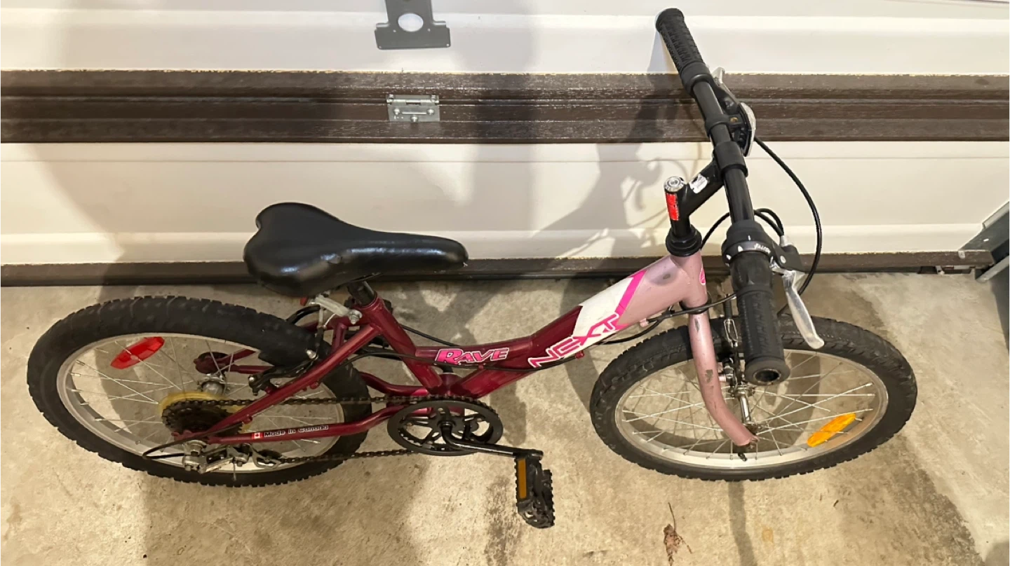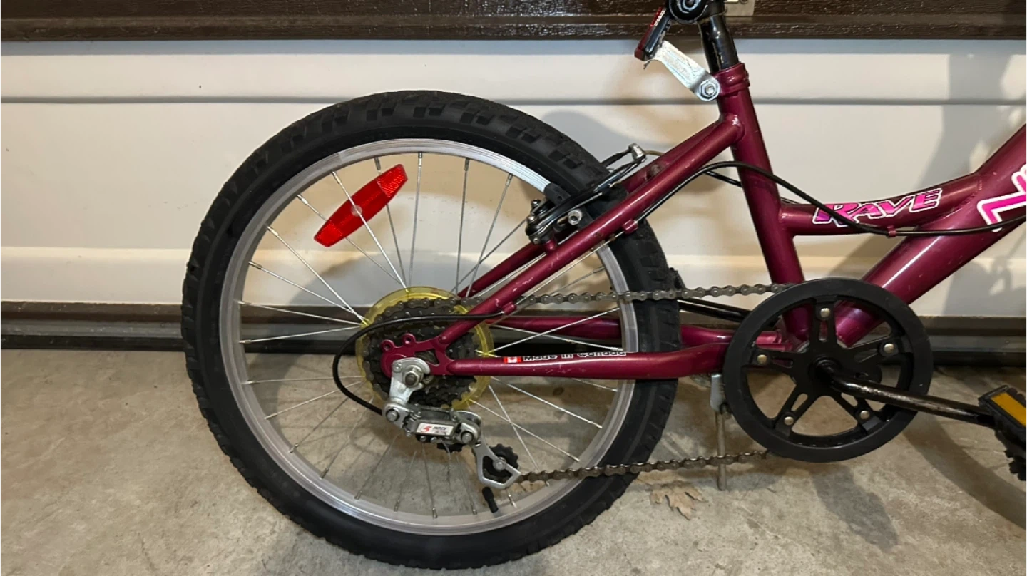 This purple NEXT "Rave" bicycle is made in Canada. It has 20-inch wheels and a sturdy frame, perfect for young riders learning to cycle. It's a fun way for kids to get around!