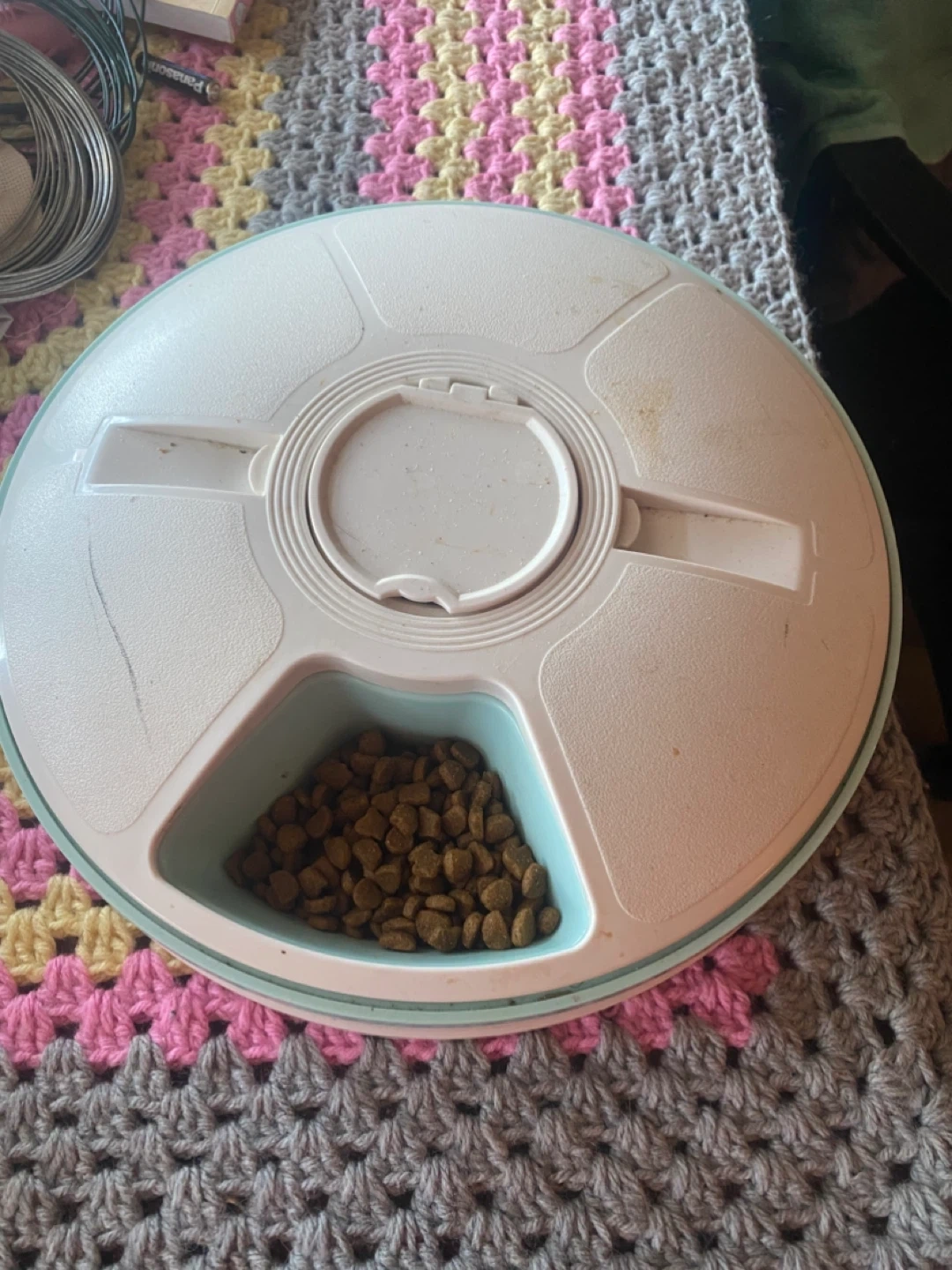 This is a multi-compartment pet food dispenser. It's made of durable plastic and has rotating sections to keep food fresh. It's great for portion control or separating different types of food.