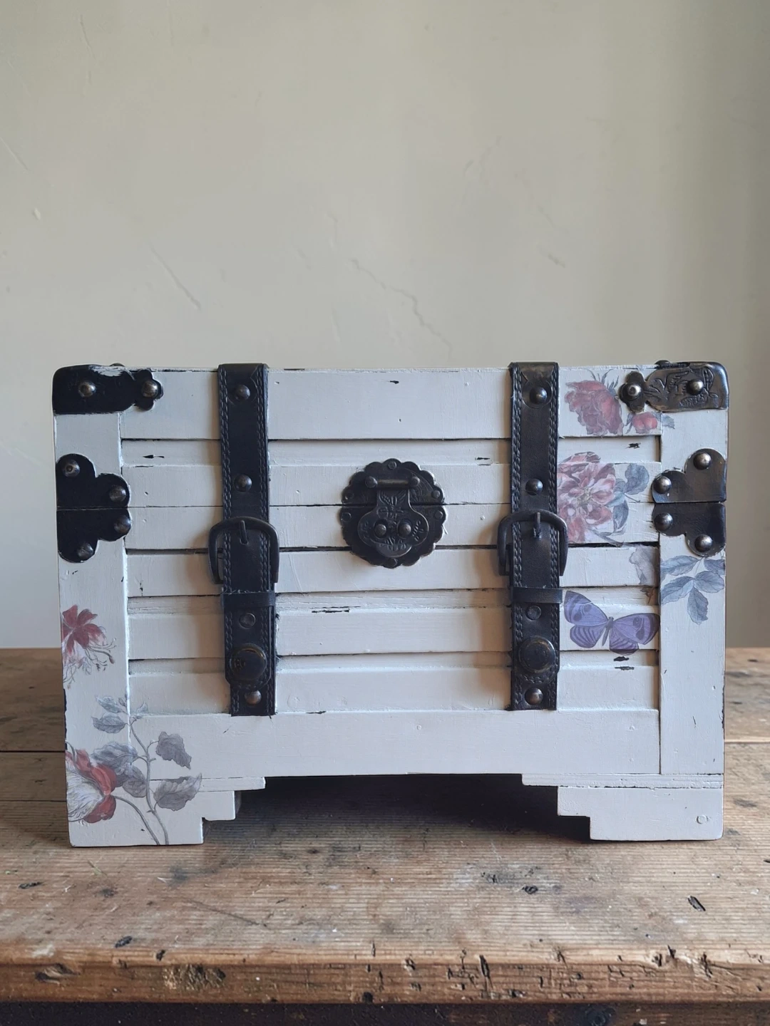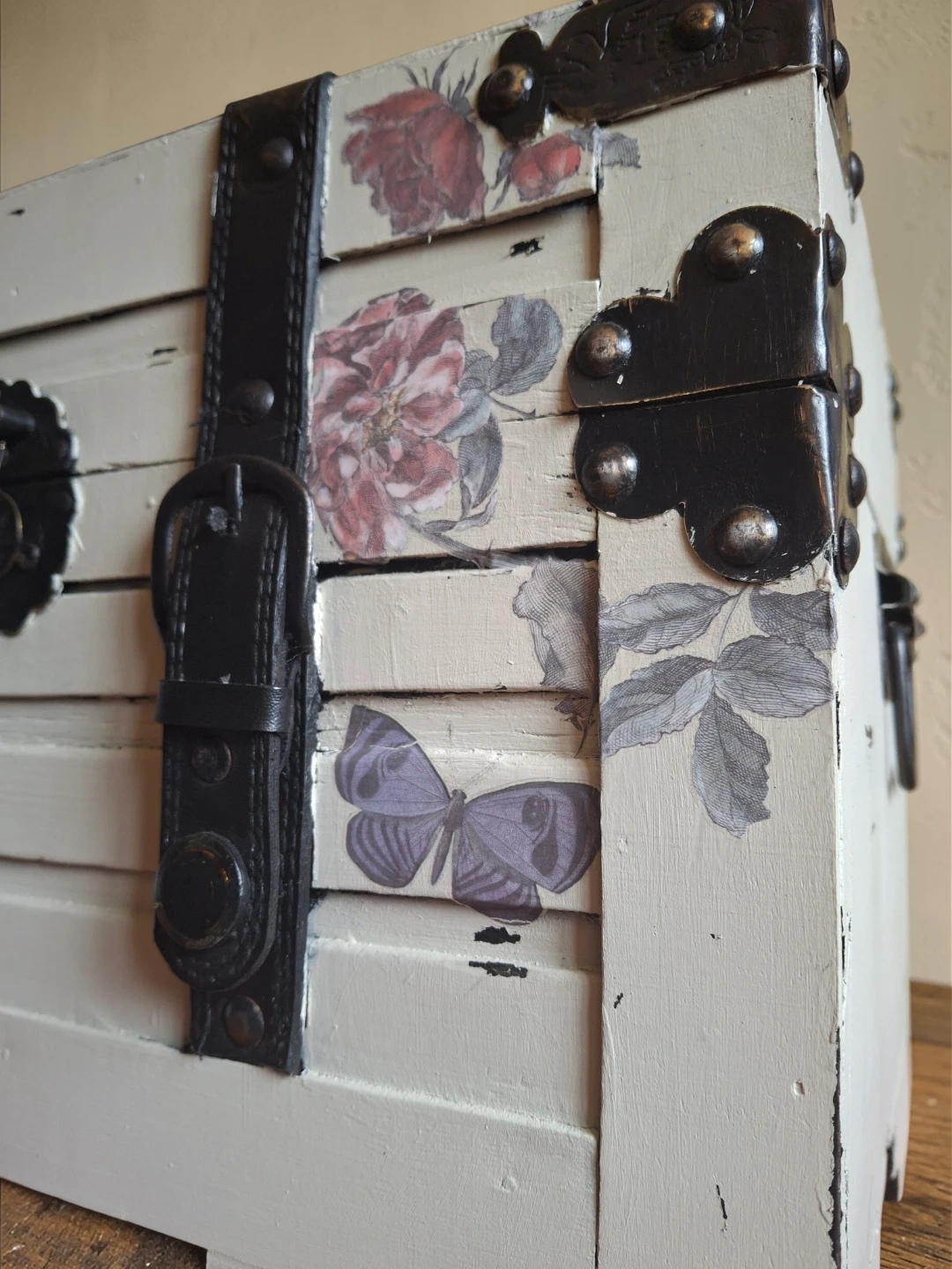 This decorative trunk is perfect for storing keepsakes or small items. It features a distressed white finish with beautiful floral and butterfly paint inlays. The faux leather straps and metal hardware add a vintage touch. A charming accent piece for any room! 14Wx10Hx9.5D. Pickup near Lakeview Park in Oshawa.