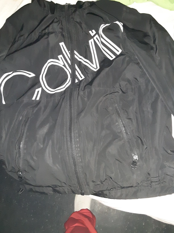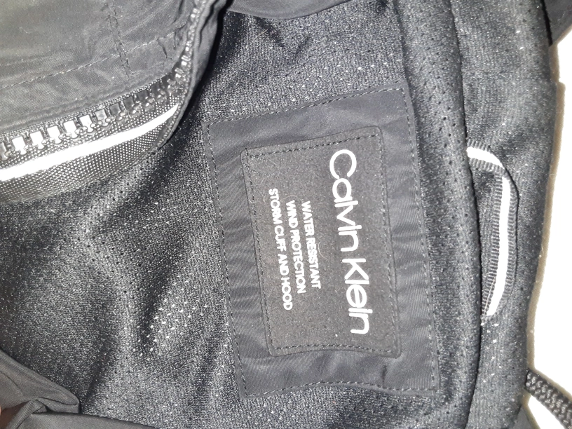 Men's black windbreaker. Water resistant. Storm cuff and hood. Full zip closure. Two zippered pockets. Features a large Calvin Klein logo on the front. one zipper is broken on the right pocket